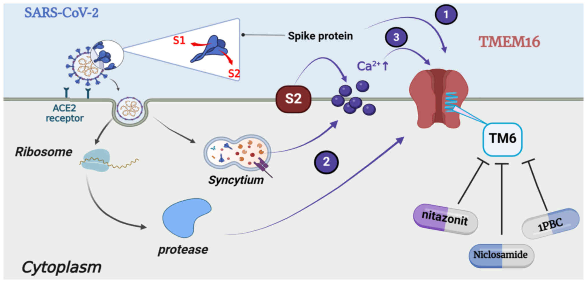 Furthermore, hexachlorophene, dichlorophenol, gefitinib (156), trifluoperazine (16), serotonin reuptake inhibitors and ivermectin (157), which target TMEM16A, can also inhibit the spike protein-induced formation of syncytia. Thus, screening specific drugs may reveal a common mechanism underlying the spike protein-dependent cell-cell fusion. Since the possibility of the recurrence of another COVID-19 pandemic is high, drug development is an indispensable part of future research.