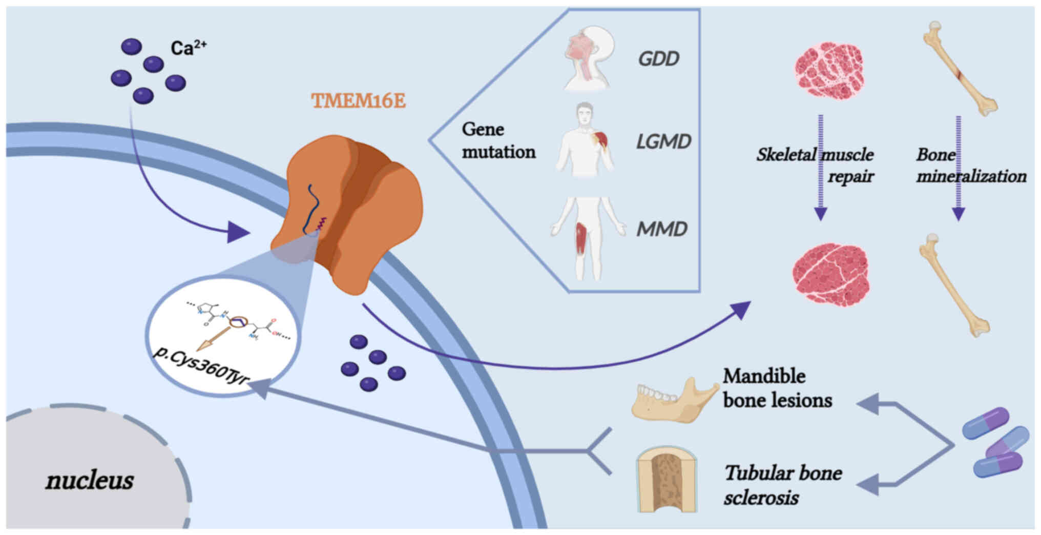 TMEM16E is a 913 amino acid protein with a Ca2+-activated phospholipid scramblase activity (160). TMEM16E is significantly expressed in muscles and bones, with Ca2+ activation involving TM4 and 5 (41). Mutations in the gene encoding TMEM16E in humans are associated with two genetic disorders: GDD, a rare skeletal-system-related syndrome associated with bone deformity and increased fragility (161), and limb-girdle MD (LGMD), a type of progressive MD (162,163). A recent model demonstrated that GDD is characterized by the manifestation of tubular bone sclerosis and mandible bone lesions, including those of a giant jawbone, arched tibia, fragility, sclerosis and cortical thickening of the femoral and tibial epiphysis (162). In the blood culture of this model, the number of osteoblasts increased while the number of osteoclasts decreased (162). The p.Cys360Tyr mutation in TMEM16E inhibits receptor activator of NF-κB ligand-induced p65, Erk, p38 and AKT phosphorylation, implying that multiple signal transduction processes contribute to osteoclast maturation and bone resorption (164). A recent study has assisted in generalizing the correlations between the GDD-associated genotype and the phenotype by extending the observations made to the GDD mutants of TMEM16E such as p.Arg215Gly, p.Cys356Gly/Arg/Tyr, p.Cys360Tyr, p.Ser500Phe and p.Gly518Glu (42). In the proposed model, p.Cys360Tyr causes osteosclerosis with a high bone turnover and can be a potential target for treating GDD (Fig. 7).