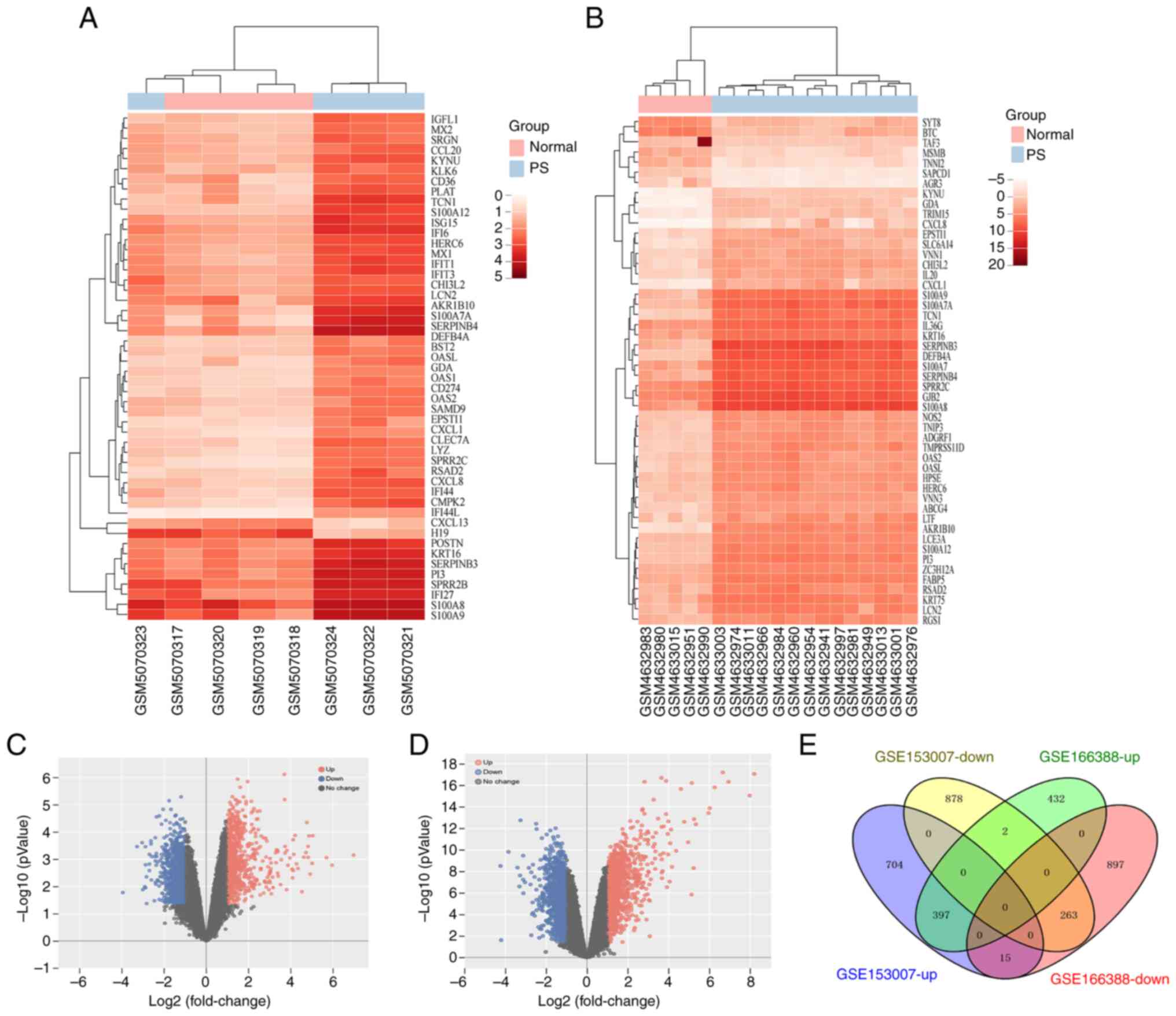 The raw data from two datasets (GSE166388 and GSE153007) were obtained from the GEO database to identify DEGs associated with psoriasis using GEO2R. There were 2,006 (831 up- and 1,175 downregulated) in the GSE166388 dataset, and 2,259 DEGs (1,116 up- and 1,143 downregulated mRNAs) in the GSE153007 dataset (Fig. 1). In addition, 660 overlapping DEGs, comprising 263 downand 397 upregulated mRNAs, were obtained using the online bioinformatics program Venny 2.1.0 (Fig. 1E).