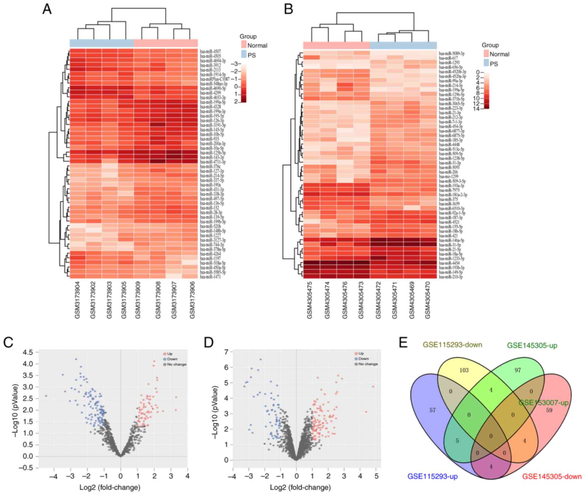 The raw data from GSE115293 and GSE145305 were obtained from the GEO database to identify DEMs. The GSE115293 dataset had 177 (66 up- and 111 downregulated), whereas the GSE145305 dataset contained 173 DEMs (106 up- and 67 downregulated; Fig. 2). Additionally, nine intersecting DEMs were identified using Venny 2.1.0. These DEMs included five up- and four downregulated miRNAs (Fig. 2E; Table II).