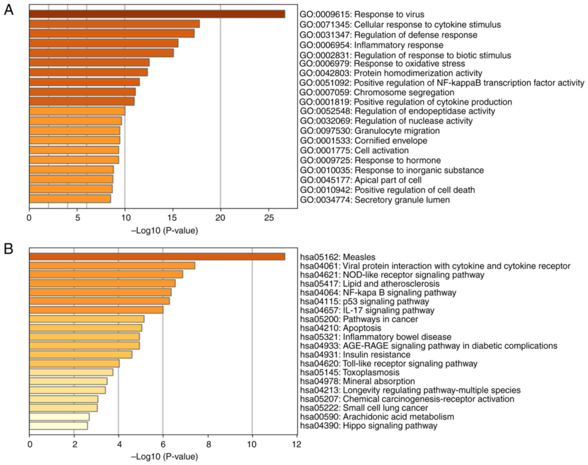 For all the overlapping DEGs, GO function annotation and KEGG pathway enrichment analyses were conducted using Metascape (version 3.5.20240101, metascape.org/gp/index.html#/main/step1). A significance level of P<0.01 was applied. R tool org.Hs.eg.db (version 3.1.0, bioconductor.org/) was used for GO annotation of overlapping DEGs. KEGG pathway gene annotation for overlapping DEGs was obtained using KEGG REST API (version 20230301, kegg.jp/kegg/rest/keggapi.html). Enrichment results were obtained by enrichment analysis using the clusterProfiler R package (version 3.14.3; bioconductor.org/packages/release/bioc/html/clusterProfiler.html). Statistical significance was defined as P<0.05 and false discovery rate (FDR)<0.1.