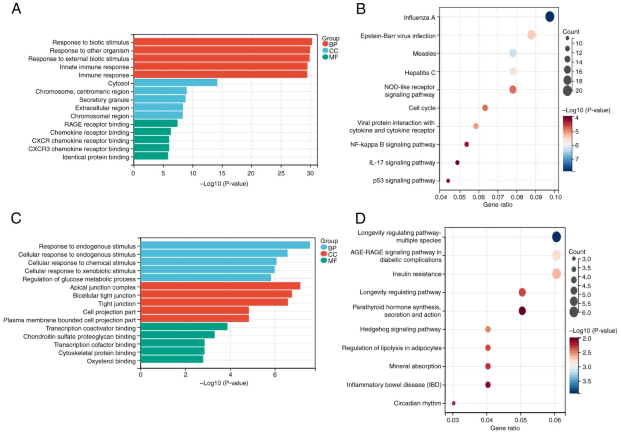 First, all 660 identified intersecting DEGs were subjected to GO and KEGG analysis using Metascape to investigate their pathways and functions. The top 20 KEGG pathways and GO functional annotation results are shown in Fig. 3A and B. The top 10 KEGG pathways and top 5 GO annotations (including BP, CC and MF) were then applied to 397 overlapping up- and 263 downregulated genes between GSE166388 and GSE153007. According to the results, 'response to biotic stimulus' in BP, 'cytosol' in CC and 'RAGE receptor binding' in MF were the most enriched terms for upregulated genes in the GO analysis (Fig. 4A). 'Measles', 'influenza A' and 'Epstein-Barr virus infection' were the primary enriched pathways in KEGG analysis of the upregulated genes (Figs. 4B and S1). Concurrently, 'response to endogenous stimulus' in BP, 'apical junction complex' in CC and 'transcription coactivator binding' in MF were the most enriched terms for downregulated genes in GO analysis (Fig. 4C). 'Insulin resistance', 'AGE-RAGE signaling in diabetic complications' and 'longevity regulating pathway-multiple species' were the key enriched pathways for downregulated genes in the KEGG enrichment analysis (Figs. 4D and S2).