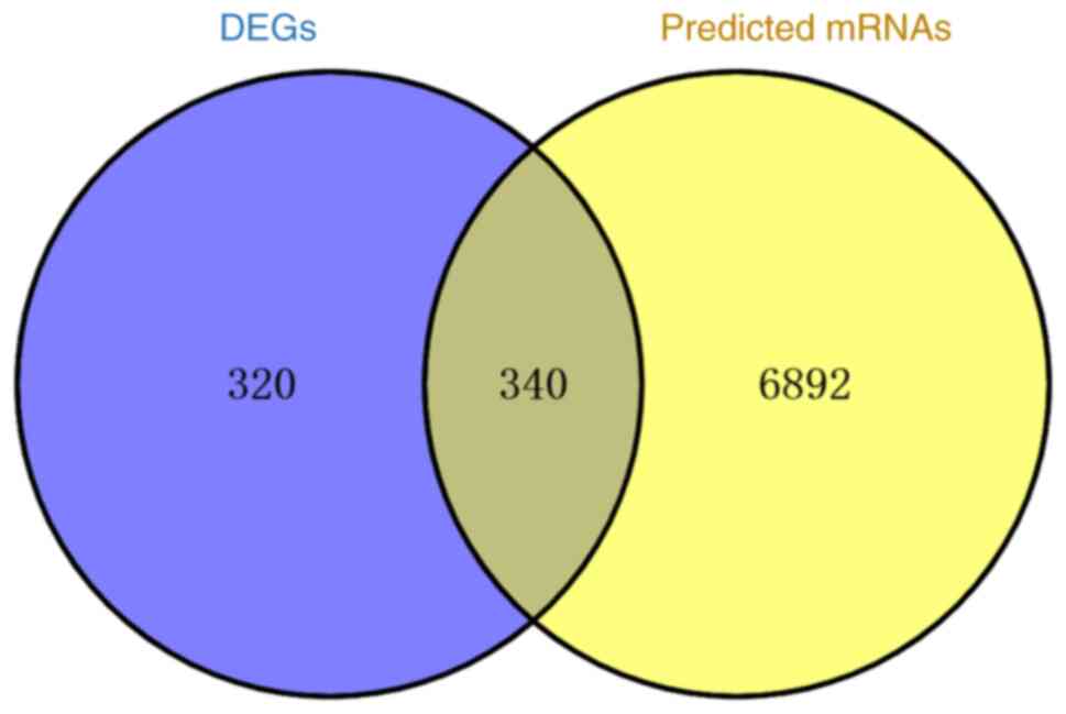Using miRNet, the downstream target genes of nine intersecting DEMs were predicted, yielding 7,232 anticipated target genes. To identify target genes for construction of the miRNA-mRNA network, 660 crossover DEGs and projected miRNA target genes were trimmed simultaneously using Venny 2.1.0 (Fig. 5), resulting in 340 dysregulated crossover target genes.