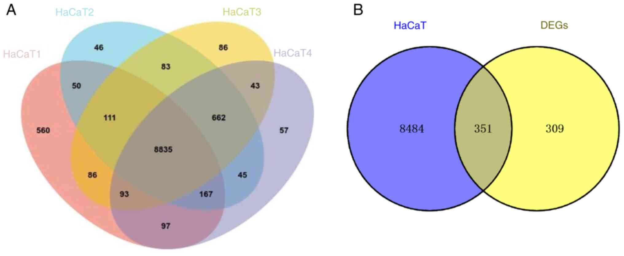 The raw RNA-sequencing data from the GSE202683 dataset was obtained from GEO database, which contained gene expression levels of four HaCaT cell samples from normal individuals. The sequencing results of these samples in the dataset were compared using the online bioinformatics tool Venny 2.1.0 and the overlapping genes were identified. Using a Venn diagram, the intersection of the HaCaT genes and the DEGs was identified to extract co-expressed genes between the psoriatic skin samples and the HaCaT cell line for further screening.