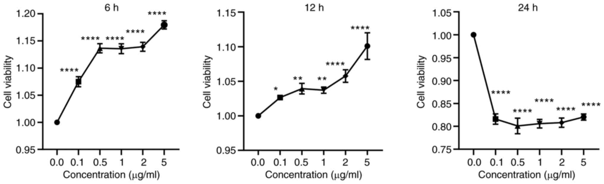 The viability of HaCaT cells treated with LPS was assessed using CCK-8 reagent (Fig. 9). Compared with 0.0 μg/ml LPS, HaCaT cell viability increased after 6 and 12 h of LPS stimulation but decreased after 24 h. After 6 and 12 h of LPS stimulation, the cell viability of HaCaT cells changed significantly when the concentration of LPS was 0.0-0.5 μg/ml and 2-5 μg/ml. The viability of HaCaT cells was the highest after LPS stimulation for 6 h. Since the change of LPS concentration has a great influence on the viability of HaCaT cells, and when the LPS stimulation concentration is ~1 μg/ml, the viability of HaCaT cells is relatively stable. Therefore, treatment with 1 μg/ml LPS for 6 h was selected for subsequent experiments.