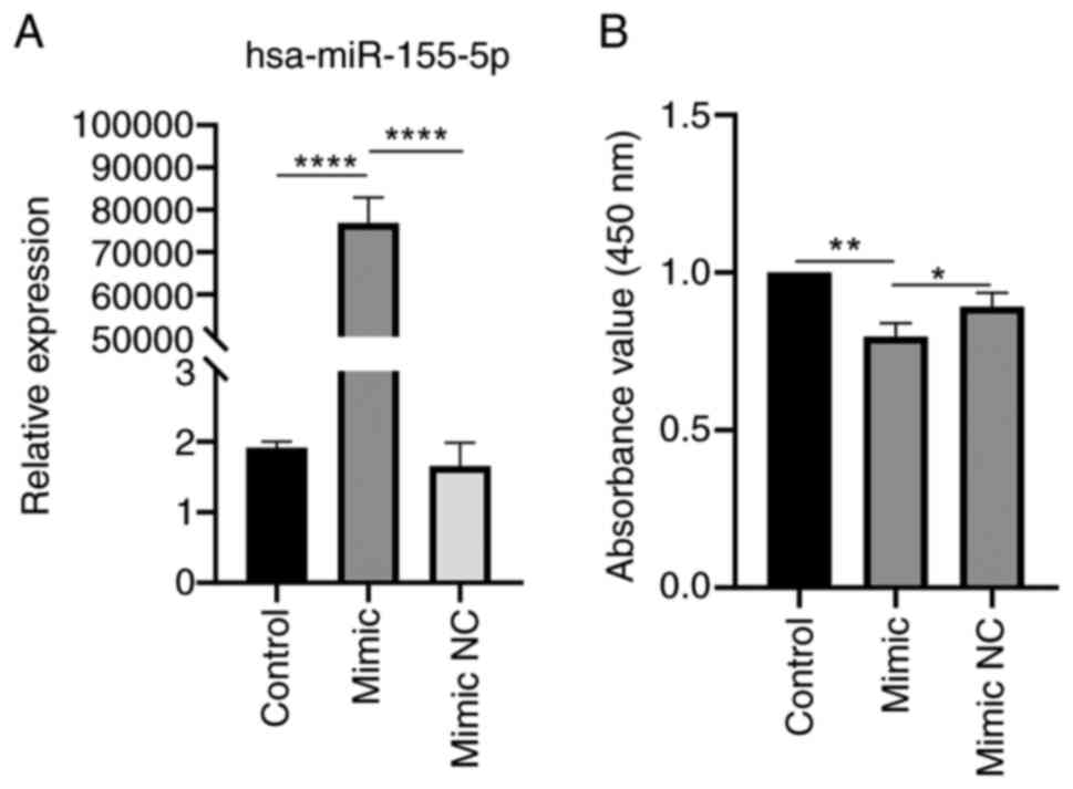 HaCaT cells were transfected with miR-155 mimic and NC to evaluate the effect of miR-155 on the biological function of cells. miR-155 mimic significantly enhanced expression of miR-155 (Fig. 10A). HaCaT cell proliferation was assessed using CCK-8 reagent 48 h after transfection. miR-155 mimic significantly suppressed HaCaT cell proliferation compared with control and mimic NC group (Fig. 10B). Overexpressing miR-155 may prevent proliferation of HaCaT cells.