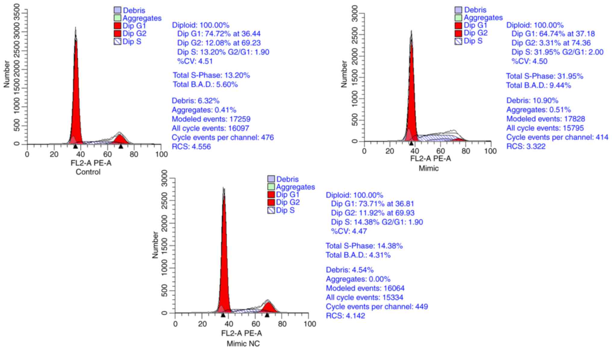 Following transfection with the miR-155 mimic and corresponding mimic NC, flow cytometry was conducted. miR-155 mimic group had significantly fewer cells in G1 and G2 phases and significantly more cells in S phase compared with the control and mimic NC groups. However, there was no significant difference in the cell cycle distribution between the control and mimic NC groups (Fig. 11). Overexpression of miR-155 promoted cells from G1 phase into S phase and arrested cells in the S phase, thus significantly the number of cells in S phase.