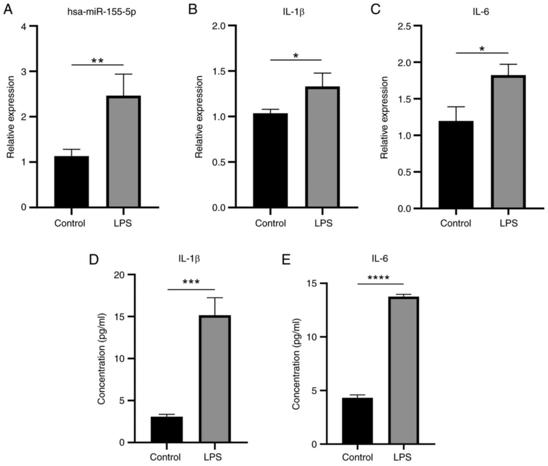 RT-qPCR results showed that miR-155 expression was significantly higher following LPS stimulation compared with untreated control (Fig. 12A). Similarly, levels of IL-1β and IL-6 inflammatory cytokines were also higher (Fig. 12B and C). ELISA demonstrated IL-1β and IL-6 levels were significantly elevated following LPS stimulation (Fig. 12D and E). These results suggested that LPS promoted the secretion of inflammatory factors by HaCaT cells. LPS was successfully used to establish an in vitro inflammatory cell model. In line with the aforementioned bioinformatics study, levels of miR-155 were raised during in vitro inflammatory stimulation.