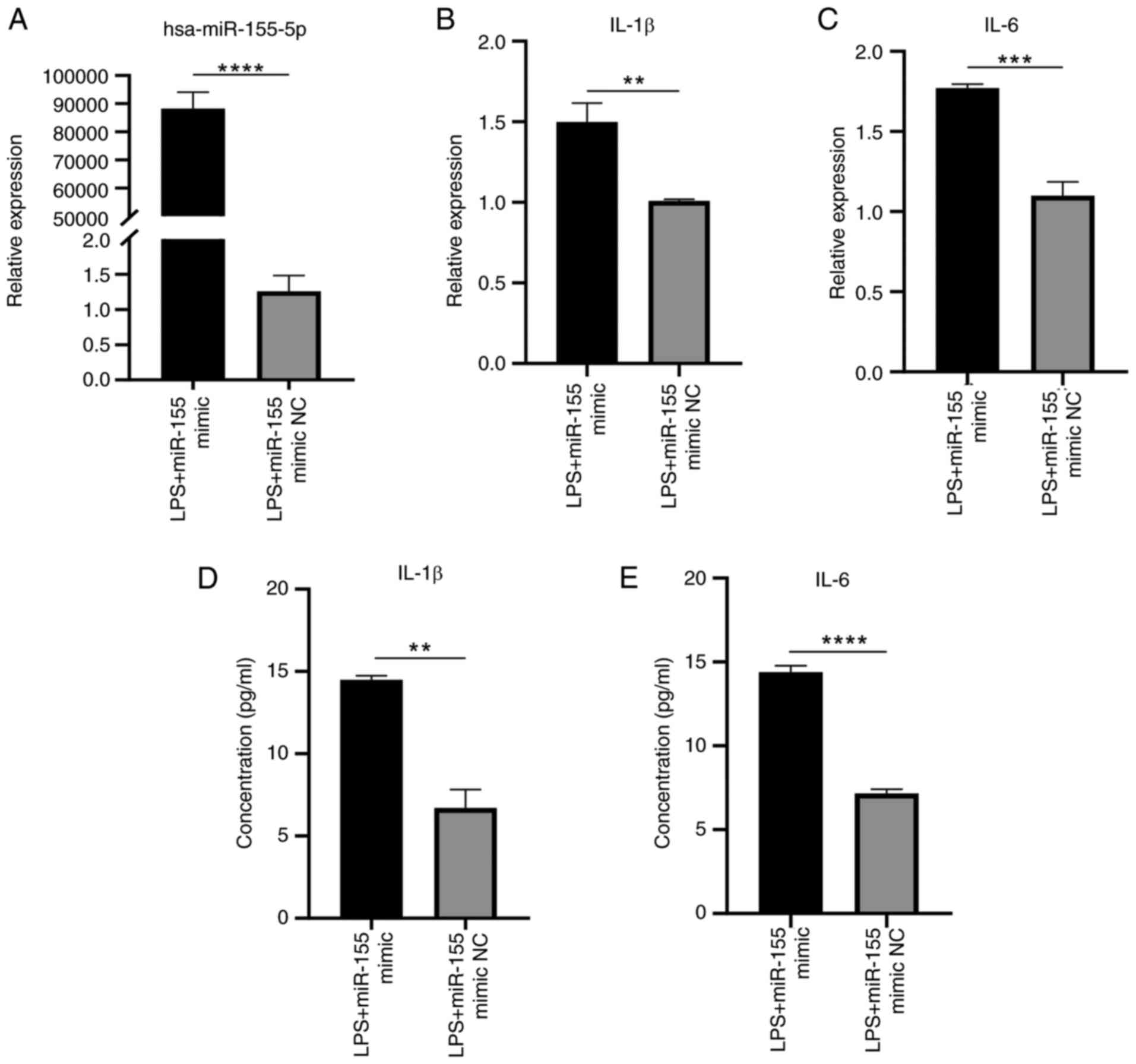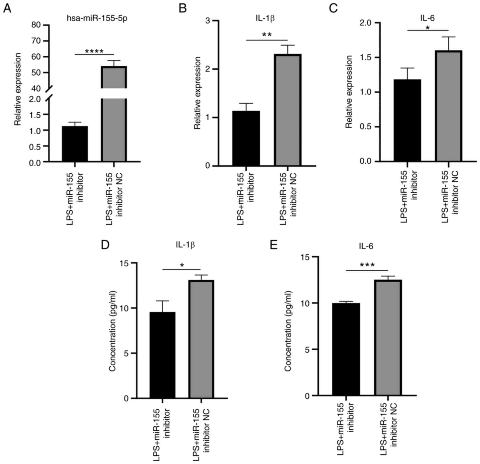 RT-qPCR demonstrated that suppressing miR-155 expression during LPS stimulation significantly decreased miR-155 expression levels compared with NC (Fig. 14A). Silencing miR-155 expression significantly reduced the expression of IL-1β and IL-6 (Fig. 14B-E). Taken together, these findings indicated a significant decrease in the inflammatory response of HaCaT cells under inflammatory conditions when miR-155-5p was silenced.