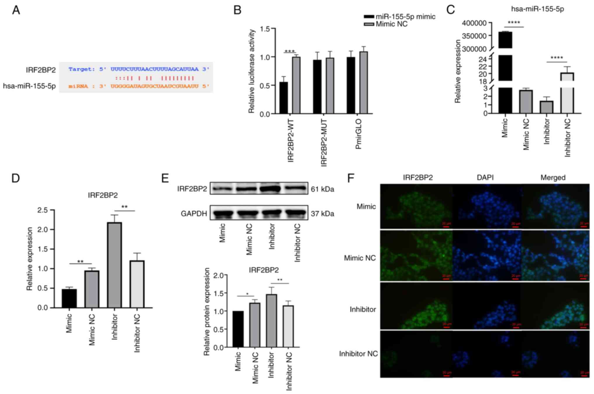 The present study also had certain limitations. miR-155 inhibitors were not used for dual verification and few psoriasis-associated indicators were detected. Further studies are required to detect psoriasis-associated indicators such as TNF-α, IL-17 and IL-23 and determine whether IRF2BP2 overexpression can reverse the increase of inflammatory cytokines induced by miR-155 mimic.