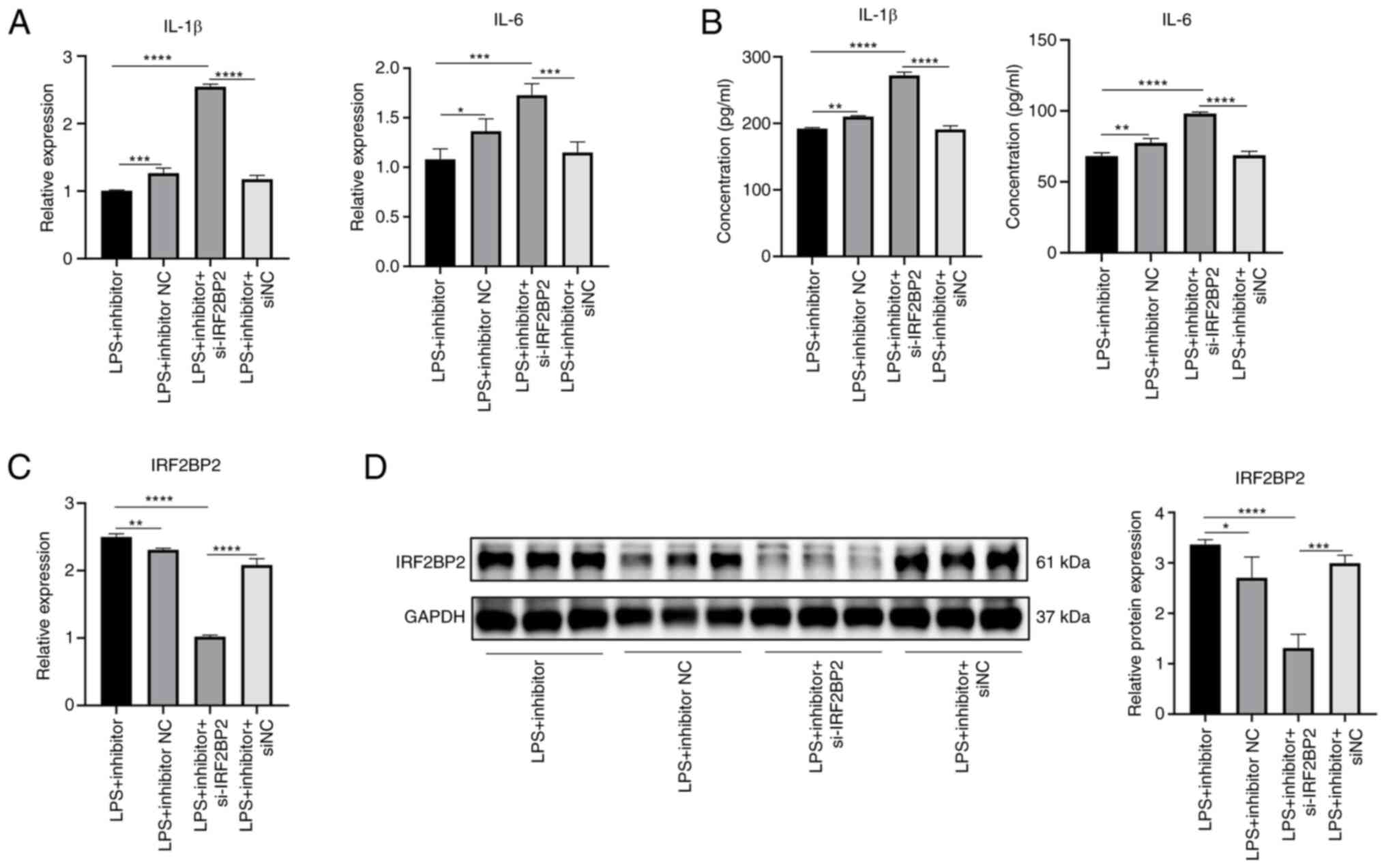 Knockdown efficiency of si-IRF2BP2 is shown in Fig. S3. RT-qPCR and ELISA showed that under LPS stimulation, the gene expression and protein secretion of IL-1β and IL-6 were significantly decreased in the miR-155 inhibitor group compared with inhibitor NC group (Fig. 16A and B). Under LPS stimulation, gene expression and protein secretion levels of IL-1β and IL-6 in miR-155 inhibitor + si-IRF2BP2 group were significantly increased compared with miR-155 inhibitor group (Fig. 16A and B). miR-155 inhibitor increased expression of IRF2BP2 gene and protein under LPS stimulation (Fig. 16C and D). However, expression levels of IRF2BP2 gene and protein were significantly decreased in the miR-155 inhibitor + si-IRF2BP2 compared with the miR-155 inhibitor group. Collectively, these results suggested that inhibition of inflammatory cytokine expression by miR-155-5p inhibitor was reversed by knockdown of IRF2BP2 and miR-155-5p regulated inflammation in HaCaT cells by targeting IRF2BP2.