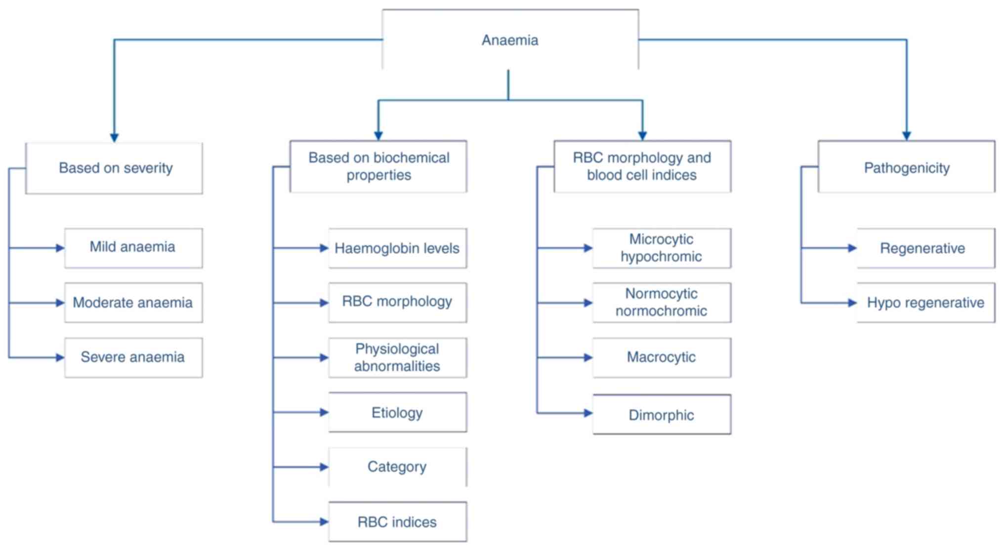 Anaemia is a condition in which the body does not have enough healthy red blood cells (RBCs) to carry adequate oxygen to the body tissues. RBCs provide oxygen to body tissues, and insufficient oxygen levels can lead to sensations of fatigue or weakness. According to the World Health Organization (WHO), anaemia is a serious global public health problem that particularly affects young children, menstruating adolescent girls, and women, pregnant and postpartum women. It is estimated that 500 million women between the ages of 15 and 49 years and 269 million children between the ages of 6 and 59 months are affected worldwide. Globally, (1 May 2023) it is estimated that 40% of all children aged 6-59 months, 37% of pregnant women, and 30% of women 15-49 years of age are affected by anaemia (sourced from https://www.who.int/news-room/fact-sheets/detail/anaemia#). Similarly, it also states that ~37% (32 million) of pregnant women were also affected by anaemia in 2019. In the world, African and South-East Asian individuals are the most affected with an estimated 106 million women and 103 million in African and 244 million women and 83 million children in South-East Asian regions. The contributing reasons can be malnutrition, poverty, infections, inflammations, and gynaecological and obstetric conditions. According to a survey in India by National Family Health Survey (NFHS-5) in 2019-2021, 25.0% of men (15-49 years), and 57.0% of women (15-49 years), 31.1% in adolescent boys (15-19 years), 59.1% in adolescent girls, 52.2% in pregnant women (15-49 years) and 67.1% in children (6-59 months) were found anaemic, which was a drastic change from the NFHS-4, where the prevalence of anaemia was ~50.3% totally (1,2). Anaemia is a syndrome of an underlying illness of various conditions such as cancer, rheumatoid arthritis, chronic renal disease, etc., rather than a disease in and of itself (3,4). Anaemia can be caused by a combination of several factors, such as chronic diseases, nutritional deficiencies, bone marrow disease, and blood disorders. In some cases, it can be due to a combination of factors, and thus identification and classification may help in further treatment.