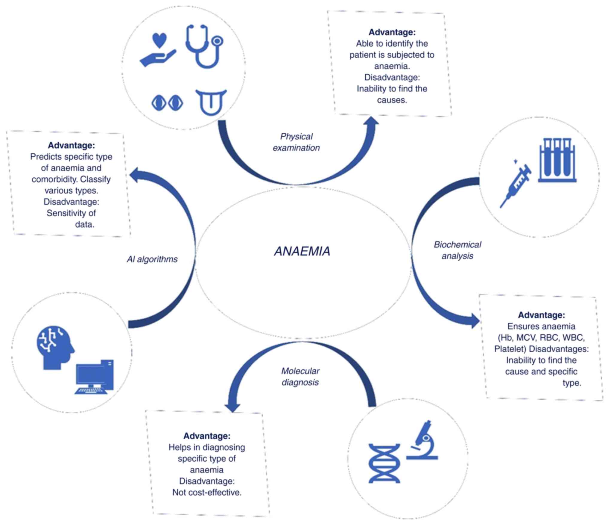 The process of diagnosing diverse types of anaemia encompasses a multifaceted process that integrates clinical evaluation, laboratory techniques, in some instances molecular techniques, and in recent days prognosis and classification using artificial intelligence (AI) methods, as illustrated in Fig. 2.
