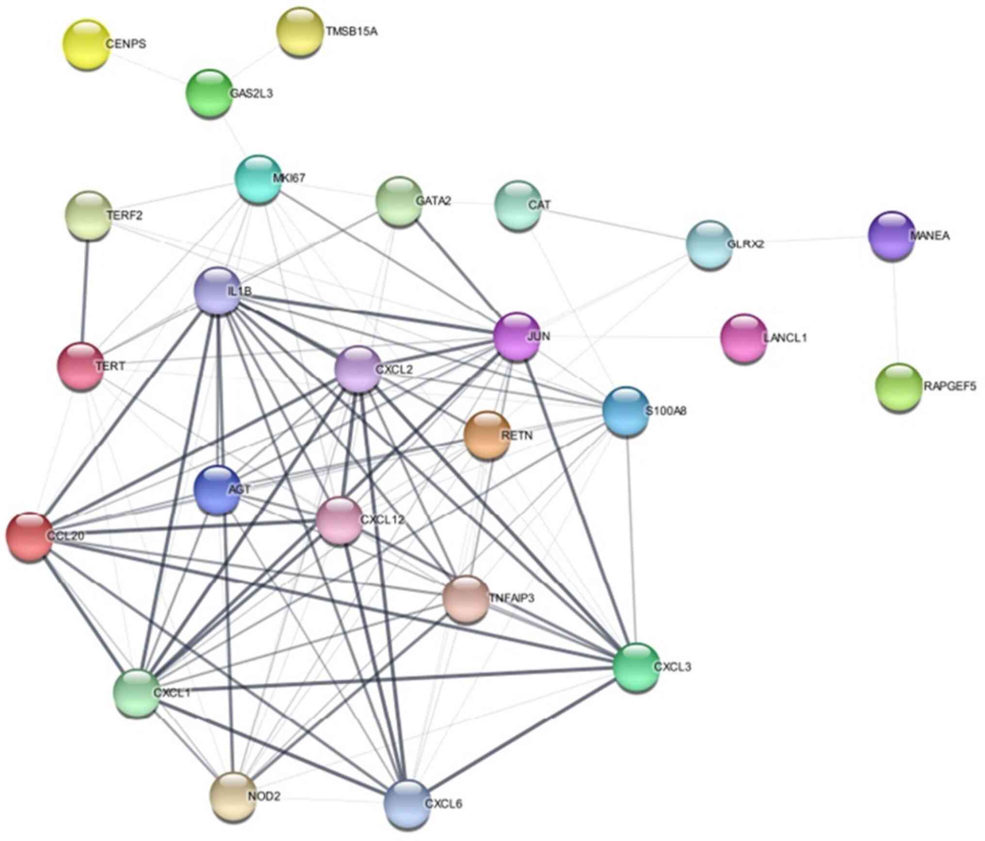 According to the literature review, the most commonly expressed genes are discussed in Table III. Certain genes were also found to be co-similar with other diseases, such as FA, and telomerase diseases. Likewise, most of the genes are involved in the inter and mitotic phases of cell division. Genes are subjected to network analysis using the STRING database (https://string-db.org). STRING is an online bioinformatics tool that provides information on protein-protein interaction, functional annotation, enrichment analysis, and network analysis. The specified genes are input into STRING with low confidence, allowing no more than five interactions in their configuration. The resulting network is visually represented in Fig. 4.