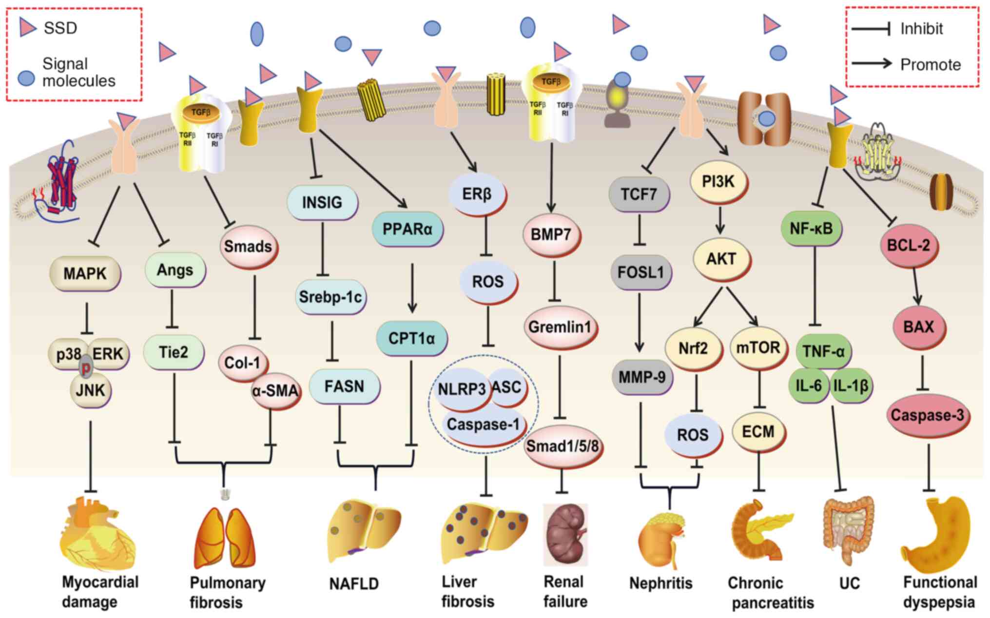 Peritoneal dialysis has the potential to enhance life quality and prolong survival in patients with renal failure; however, peritoneal fibrosis can frequently lead to treatment discontinuation (83). Liu et al (84) found that SSD may alleviate peritoneal fibrosis in renal failure rats by modulating the TGF-β1/BMP7/Gremlin1/Smads pathway, though further research is needed to confirm SSD's mechanism in renal failure.