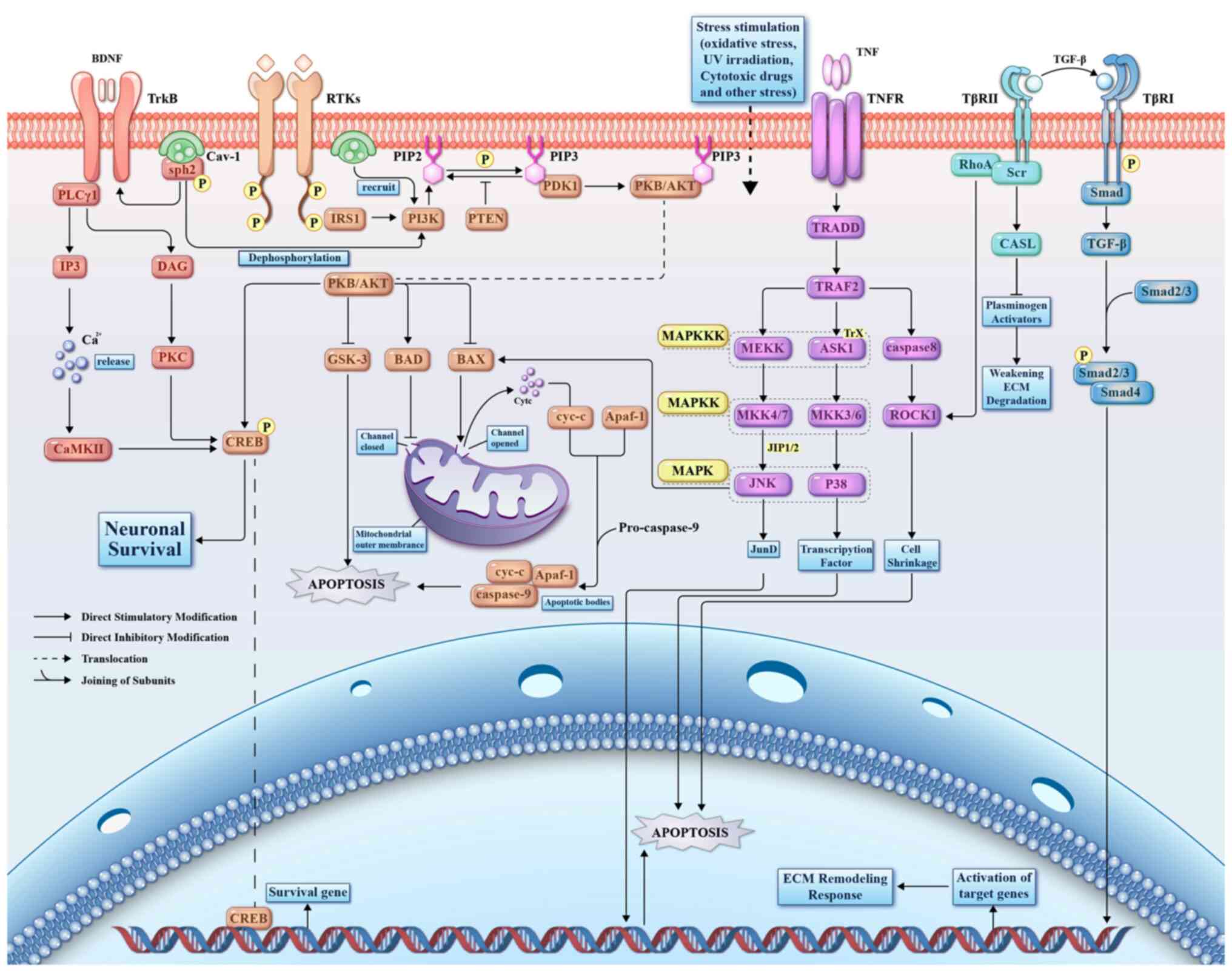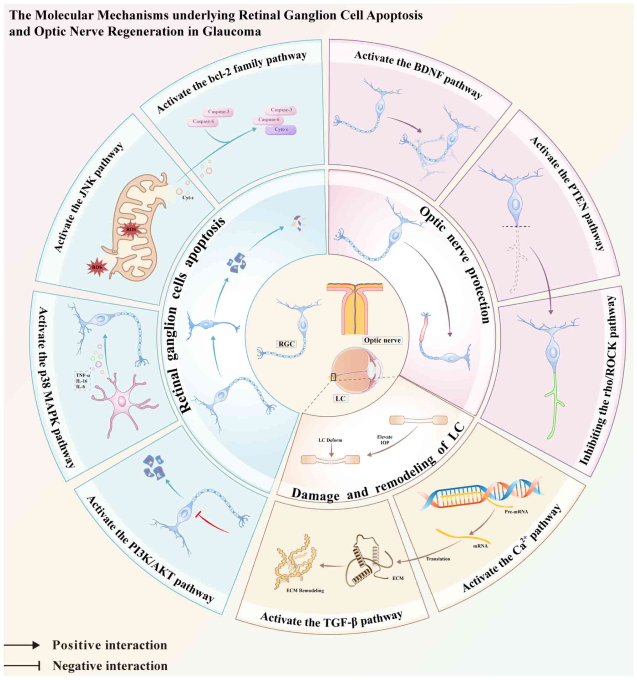 Glaucoma is a group of progressive optic neuropathies and is currently the most prevalent ocular disease worldwide, second only to cataracts in terms of blindness (1). Current estimates indicate a global prevalence of 3.5% among individuals aged 40 to 80 years, with projections suggesting a staggering 111.8 million individuals will suffer from blindness attributable to glaucoma by the year 2040 (2,3). This condition, characterized by its prevalence and impact on vision, primarily stems from the deterioration of retinal ganglion cell (RGC) axons as they traverse the optic nerve head (ONH) upon exiting the eye (4). This degenerative process results in persistent impairment of the retinal nerve fiber layer (5,6), with exacerbation often observed due to deformation of the lamina cribrosa (LC) (7). Previous investigations have established a positive correlation between elevated intraocular pressure (IOP) and high-pressure glaucoma (8), underscoring its pivotal role in inducing damage to RGC axons and subsequent cell demise (9), thereby emerging as a significant risk factor for the development of glaucoma (10). Consequently, interventions aimed at reducing IOP, through pharmacological, laser, or surgical modalities, have proven efficacious in attenuating glaucoma progression and preserving visual function (3). Nonetheless, certain presentations of glaucoma, such as those featuring normal IOP, pose challenges as they diverge from the typical paradigm (11,12). Additionally, the heterogeneity of glaucomatous subtypes, coupled with the limited effectiveness of conventional therapies, underscores the complexity inherent to managing this multifaceted condition (13). Glaucoma poses a significant challenge in clinical management, which is exacerbated by the limited efficacy of conventional treatments in reversing the optic nerve damage associated with the condition (3). Thus, a comprehensive understanding of the underlying mechanisms and pathophysiology governing glaucoma pathogenesis is required. This entails elucidating the complex signaling pathways implicated in pathogenesis to identify novel targets for interventions aimed at optic nerve protection and regeneration at the molecular level. Previous studies have highlighted the degeneration of RGCs and loss of axons, along with damage and remodeling of the LC, as pivotal events in glaucoma pathogenesis (Fig. 1) (5). Moreover, in our research (data not shown), it was found that there appears to be a certain correlation among the above-mentioned pivotal events-Caveolin-1 (Cav-1). Cav-1 cannot only prevent the degeneration of RGCs and optic nerve damage in glaucoma by positively or negatively mediating cell signaling pathways and neurotrophic factors, but also regulate the physiological and pathological changes of the LC by influencing the metabolism of the extracellular matrix (ECM), thus playing an important role in the occurrence and prevention of glaucoma (14-16). The signaling pathways activated by genetic and environmental factors constitute a complex and multifaceted system characterized by extensive crosstalk between downstream signaling molecules. Consequently, these pathways are interlinked and overlapping, thereby preventing their complete isolation. Nevertheless, the regulation of proapoptotic genes, neuroprotective factors and regenerative factors are subject to complex modulation within these pathways, ultimately culminating in glaucoma development (13). The regulatory effects within these pathways are not unidimensional but emerge from the complex interplay and mutual influence of multiple factors. In light of the structural framework of this discourse, the present review delves into the pathophysiological mechanisms of RGCs apoptosis, optic nerve safeguarding and regeneration, and LC damage and remodeling; the specific molecular mechanisms and the interrelationships of pathways are shown in Fig. 2. This categorization is based on the most extensively researched segments of pathways, with the aim of offering deeper insights into cellular processes and furnishing vital clues and targets for the treatment and pharmacological management of glaucoma.