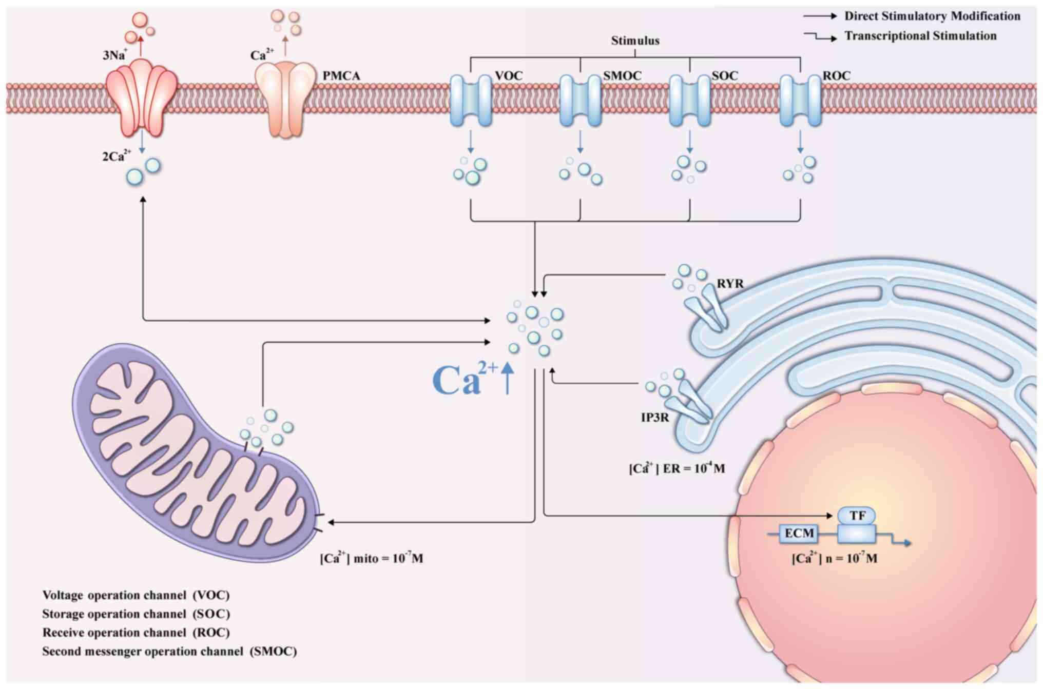 Ca2+ enter cells and interact with various Ca2+-binding proteins, serving as pivotal signaling entities in the regulation of numerous physiological processes (115). Perturbation of Ca2+ homeostasis has been implicated in various pathological conditions, including oxidative stress-induced cell death in glaucoma (116). Notably, cytoplasmic Ca2+ levels are aberrantly elevated in LC cells in models of oxidative stress-induced glaucoma (117). This elevation comprises two distinct components: The direct influx of extracellular calcium into the cytoplasm in response to the stress stimulus, and release from intracellular stores, namely the endoplasmic reticulum and sarcoplasmic reticulum, mediated by the Inositol 1,4,5-trisphosphate receptor (IP3R) and ryanodine receptor (118,119). The increase in intracellular Ca2+ in glaucomatous LC cells promotes the expression of ECM genes, thereby instigating excessive ECM deposition, as shown in Fig. 3. Consequently, fibroblasts undergo phenotypic alterations and differentiate into myofibroblasts, driving connective tissue fibrosis, and exacerbating glaucomatous optic neuropathy (120). Additionally, other studies have also demonstrated that the synthesis and secretion processes of ECM-related molecules are also regulated by Cav-1 (121,122). The decrease in Cav-1 expression contributes to the disruption of ECM remodeling, thus protecting the microenvironment around RGCs and maintaining the integrity of the structure and normal physiological functions of ocular tissues (122).