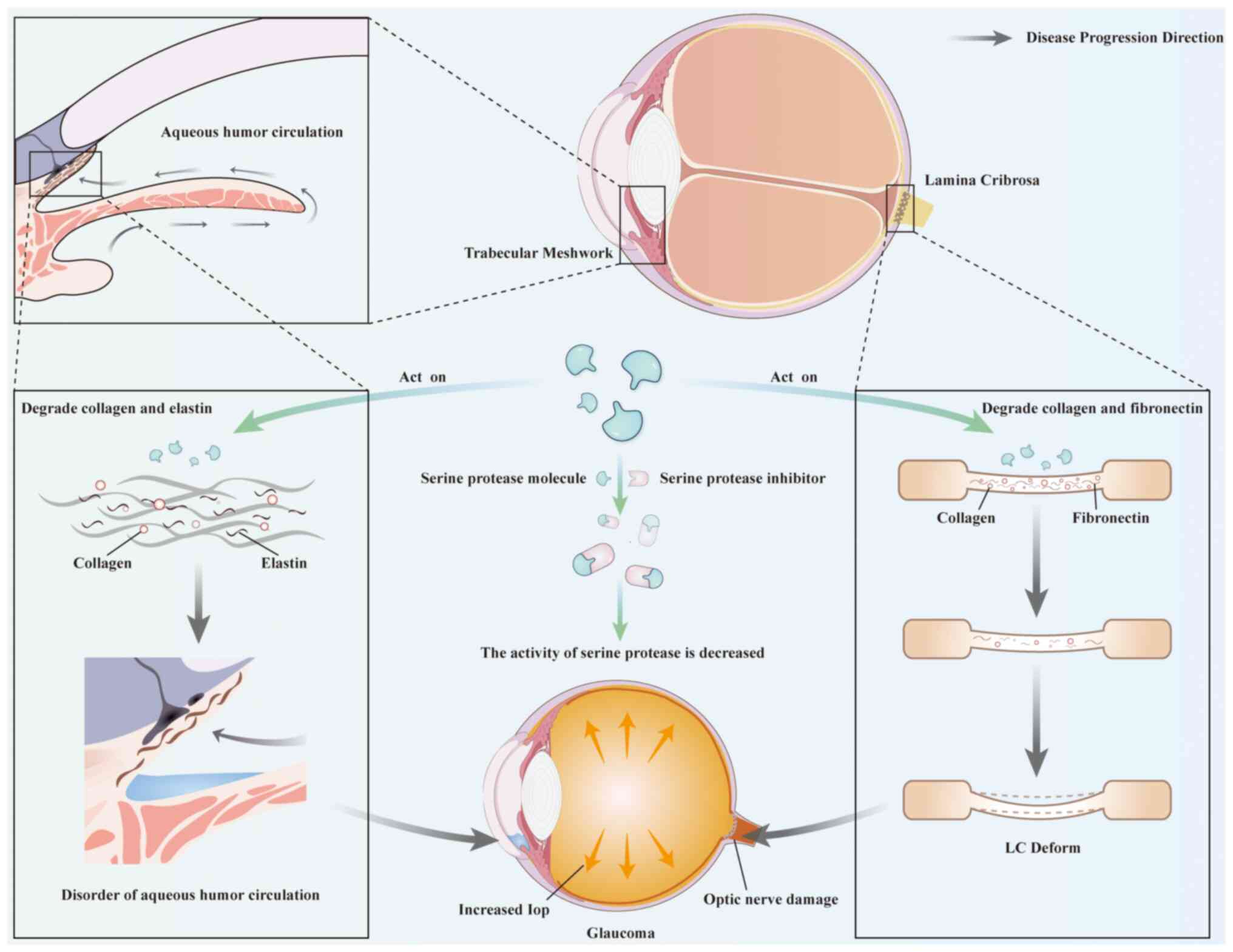 Besides, in the research on the pathogenesis of glaucoma, serine proteases and their inhibitors have also become relatively new focuses. In glaucoma, serine proteases (such as plasmin) can participate in the remodeling of the ECM and affect the survival of RGCs (155,156). Under pathological conditions, when excessive serine proteases act on the ECM in the LC, they may overly degrade the components in the ECM, making the structure of the LC loose or causing local defects, which will cause compression and damage to the optic nerve (124,157) (Fig. 5). When serine proteases act on the TM, the disorder of ECM homeostasis leads to an increase in the resistance to AH outflow and an increase in IOP (Fig. 5), thus contributing to the occurrence and development of glaucoma (158). Furthermore, it has been revealed that while the proteolytic activity of serine proteases in glaucoma increases, the protease inhibitory activity of nerve serine protease inhibitors decreases in chronic glaucoma animal models (156). SerpinA1 and SerpinA3 are important members of the serine protease inhibitor family. Elevated SerpinA1 levels have been proven to indirectly affect Wnt signaling by regulating the AKT pathway through increasing the synthesis of GSK-3β, resulting in a decrease in β-catenin levels and delaying glaucoma to a certain extent (159). Several research studies have put forward that gene therapy or the external application of nerve serine protease inhibitors, and likewise in transgenic mice with overexpressed nerve serine protease inhibitors, is capable of demonstrating a protective impact on the functions of RGCs (160-162). This protection encompasses the restoration of autophagy, microglial and synaptic functions in the context of glaucoma (163). In summary, serine proteases may damage intraocular tissues due to excessive hydrolysis in glaucoma, while their inhibitors can inhibit the harmful effects of proteases by regulating relevant signaling pathways and other means, thus playing an inhibitory role in the development of glaucoma. They are expected to become new targets for the treatment of glaucoma.