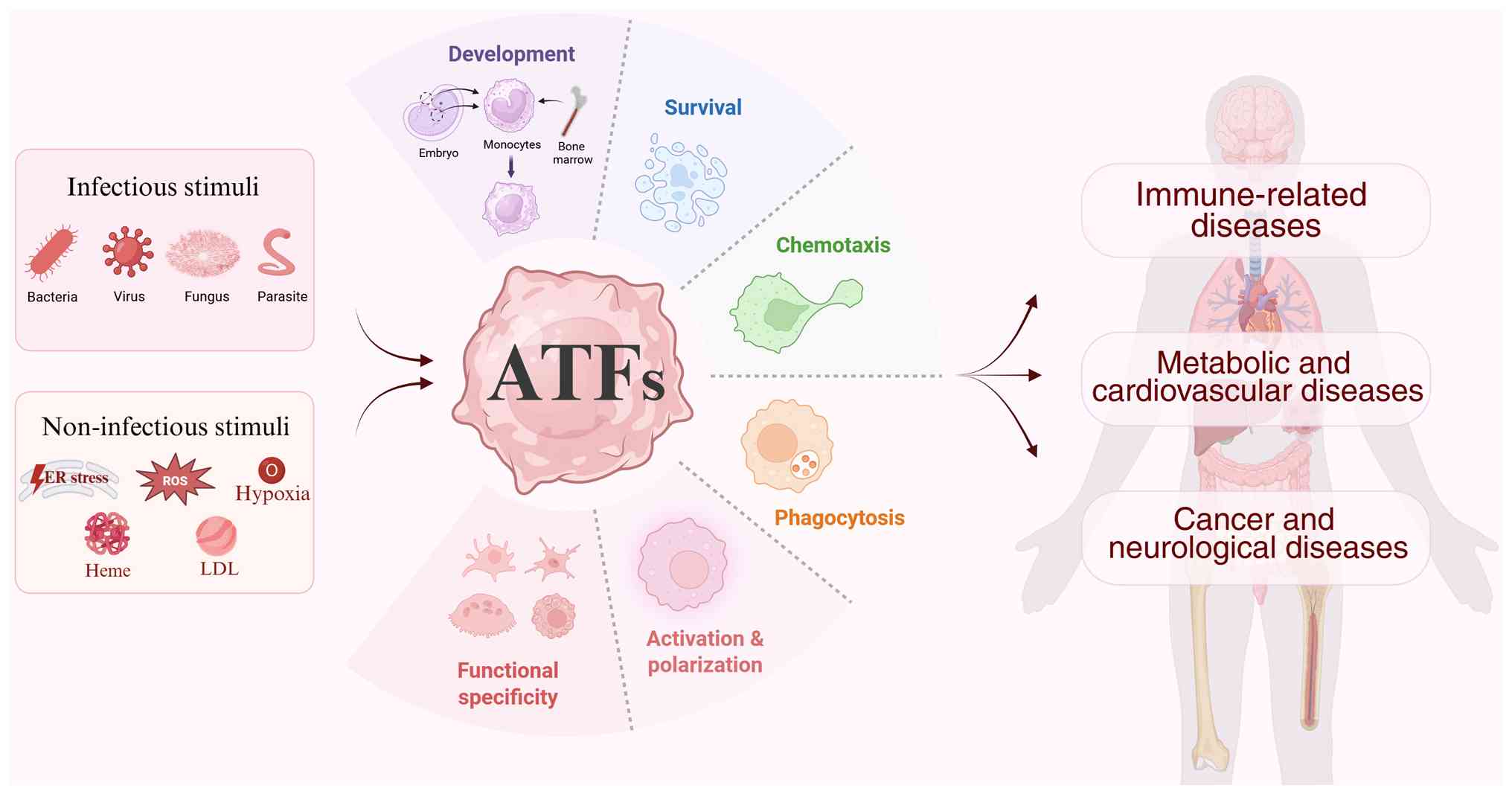 Of note, enhancing the spatiotemporal specificity of ATF-targeting interventions is critical for improving therapeutic efficacy and safety. Advanced delivery systems are under development to achieve tissue- or cell-specific targeting, ensuring that drugs could be selectively delivered into macrophages in affected tissues (236). Encouragingly, advances in nanocarrier and bioengineering technologies now enable the precise delivery of therapeutic agents to macrophages, allowing for selective modulation of ATF-associated pathways without affecting other cell types. For instance, in atherosclerosis models, macrophage-targeted nanoparticles have been utilized to deliver drugs directly to macrophages within the plaques (237). These nanoparticles substantially improved the pharmacokinetic profiles of the encapsulated drugs, enhancing their accumulation at the lesion site and promoting the therapeutic efficacy. Similarly, in viral pneumonia models, lipid nanoparticles conjugated with macrophage-specific antibodies (such as anti-F4/80) have been used to deliver siRNA to lung macrophages, effectively silenced upstream inflammatory molecules such as TAK1 (238). These findings underscore the feasibility of macrophage-targeted delivery for therapeutic interventions and highlight the substantial potential of integrating delivery technologies into ATF-targeted therapies. Therefore, innovative targeted technologies coupled with advanced delivery systems, might overcome the barrier of ATFs-targeted therapies and accelerate their clinical translation.