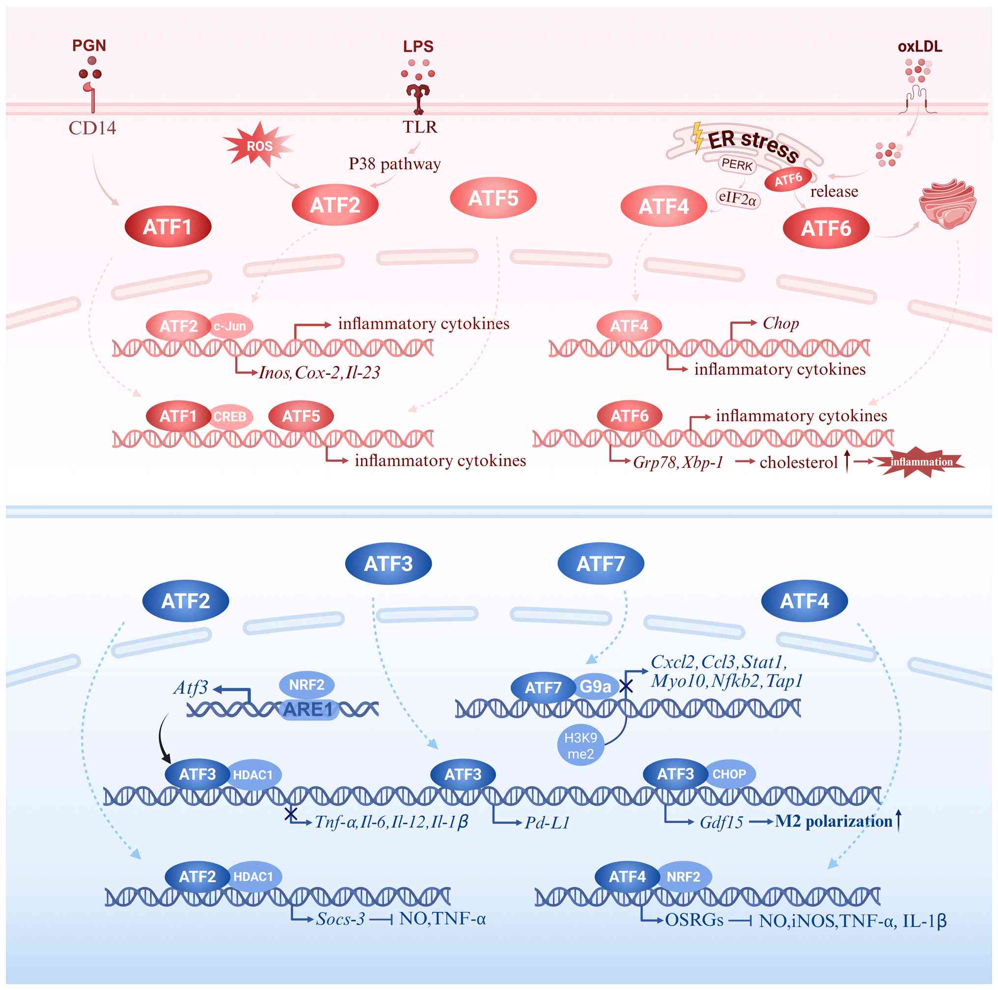 ATF family members regulate macrophage pro-inflammatory activation through multiple pathways. ATF1, activated via sensing bacterial peptidoglycan (PGN), drives pro-inflammatory cytokine transcription either in its phosphorylated form or as a dimer with CREB (153). ATF5 directly amplifies inflammatory responses by upregulating TNF-α, IL-1β and IL-6 expression (154). ATF6, a key regulatory factor in ER stress (155), is essential for initiating the UPR triggered by pattern recognition receptors such as nucleotide-binding oligomerization domain-containing protein 2 (NOD2) (106). Upon the challenge of oxLDL, ATF6 dissociates from the ER membrane, moves into the Golgi apparatus, where it is cleaved into its active form (p50-ATF6), which subsequently translocates into the nucleus to regulate target genes, such as GRP78 and XBP-1 (156). Activated ATF6 stimulates the expression of genes involved in cholesterol biosynthesis, but represses the genes associated with cholesterol efflux (Abca1, Abcg1, Lxrα), to drive cholesterol accumulation (157). ATF6 directly binds to the Tnf-α promoter to enhance its transcriptional activity, thereby activating the NF-κB and TNF signaling pathways and driving macrophages to secrete pro-inflammatory cytokines, such as TNFα, IL-1β and IL-6 (156). In liver Kupffer cells, ATF6 also mediates the pro-inflammatory enhancement of TLR4 response and cytokine production (158). Markedly, ubiquitination at K152 residue of ATF6 is essential for its antimicrobial function. Mutations at this site (ATF6-K152A) exhibit defective bacterial uptake, coupled with reduced ROS generation, diminished LC3II/ATG5 expression and impaired intracellular pathogen clearance (159). Together, these findings establish ATF1, ATF5 and ATF6 as central mediators that translate microbial and metabolic stress into potent inflammatory cytokine programs.