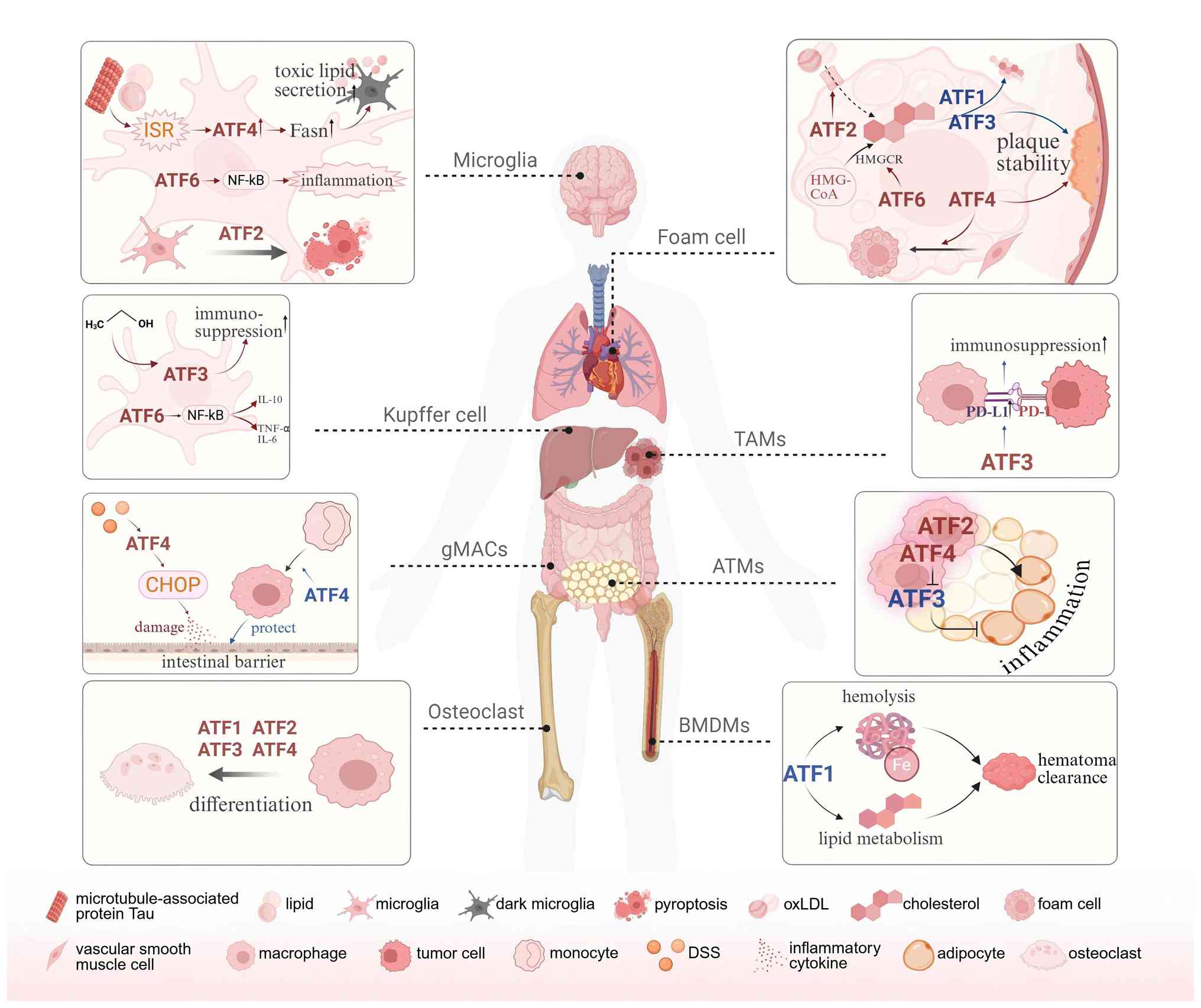 Regarding macrophage senescence and cell death, ATF4 is identified as the core responder to hypoxic stress and it rapidly accumulates in macrophage nuclei within 1-h of hypoxic challenge to activate adaptive gene networks to sustain cell viability (137). ATF3 exhibits anti-senescence properties in Pseudomonas aeruginosa infection models. Macrophages deficient in ATF3 exhibit elevated ROS levels and accelerated senescence, while ectopic ATF3 overexpression partially reverses these phenotypes (138). Additionally, in LPS-stimulated microglia, ATF2 exacerbates inflammatory pyroptosis by upregulating IL-1β, NLRP3 and key pyroptotic effector molecules such as GSDMDC1 and Caspase-1 (139).