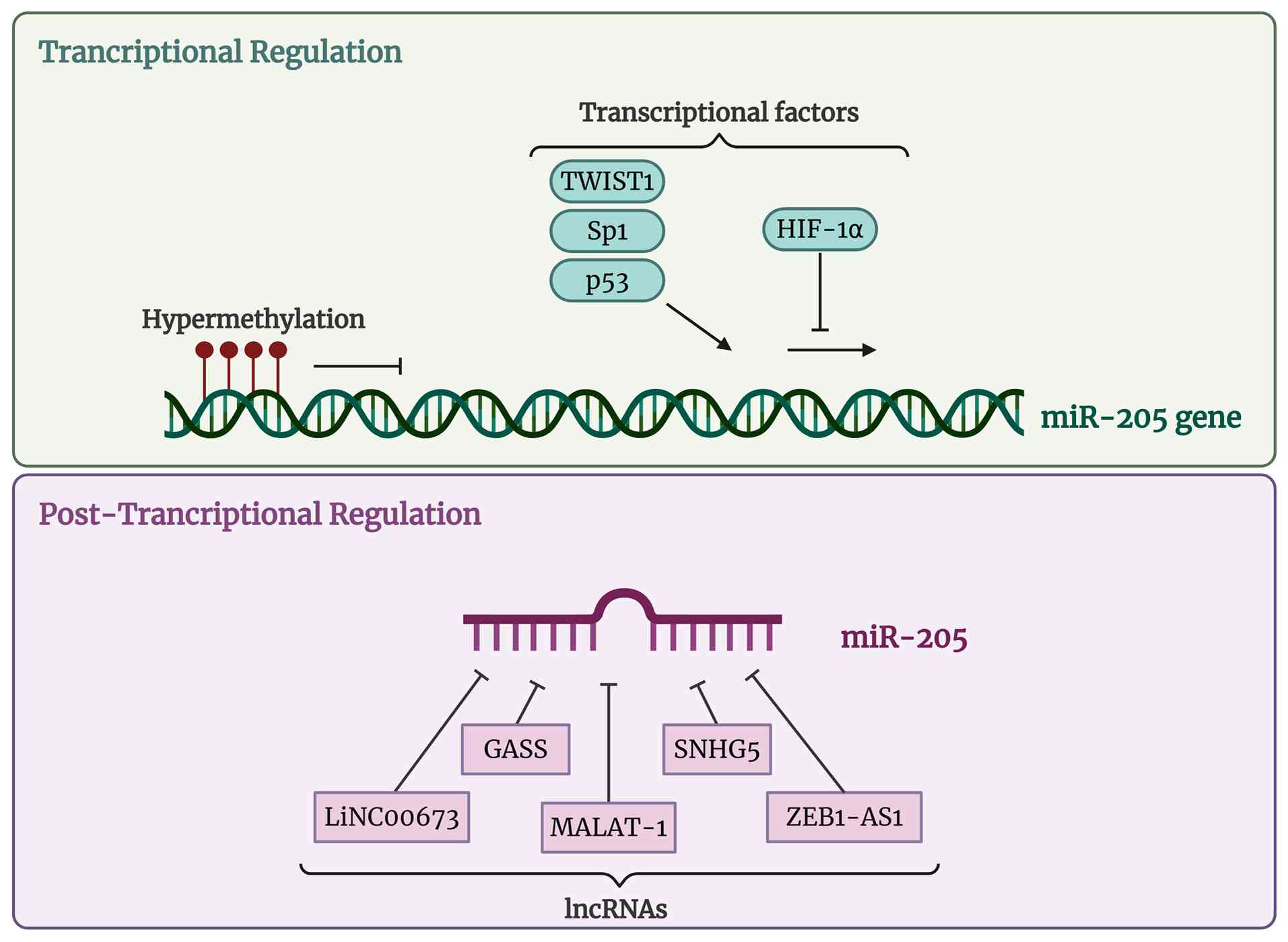 Precise regulation of miR-205 expression is essential for development, onset and progression of different alterations. Epigenetic modifications, such as CpG DNA methylation, are mechanisms for gene expression regulation which may be key miR-205 modulators. Specifically, mature miR-205 expression is inversely associated to DNA methylation. miR-205 under expression is related to high hypermethylation and chromatin changes leading to epithelial-mesenchymal transition (EMT) and cell migration (36,37). miR-205-5p transcription is commonly repressed via miR-205 locus hypermethylation and then, over-activates miR-205 targets. This fact has been associated with poor prognosis in cancer (38,39). Moreover, there are different transcription factors for miR-205, such as the p53 family, closely involved in cell cycle and apoptosis (40). P53 stimulates miR-205 expression levels promoting cell proliferation and EMT in cancer (41). Hypoxia inducible factor 1 α (HIF-1α) is a member of the p53 family. This is a transcriptional factor that represses miR-205 expression inducing EMT, angiogenesis and tumor aggressiveness (42,43). Sp1 is a transcriptional factor for miR-205 upregulation (44) in contrast to Twist1 (45). Beyond DNA methylation, histone modifications add a second layer of epigenetic control. Repressive marks such as H3K27me3 and H3K9me2 are associated with the silencing of MIR205HG, while activating marks such as H3K4me3 and histone acetylation (H3K9ac and H3K27ac) promotes an open and transcriptionally active chromatin state (37,38). These chromatin changes interact with transcription factors such as p53, Sp1 and HIF-1α integrating cellular stress and environmental signals into the regulation of miR-205 (40-44). Finally, long noncoding RNAs (lncRNAs) regulate miRNAs availability by sponging them. Increasing evidence has indicated that lncRNAs play important roles in human disorders, however, the functional implications have only been studied in a few of them. One of the most important lncRNAs related to miR-205 is MALAT1. It has been observed that under hyperglycemic conditions, MALAT1 act as a sponge for miR-205, thereby releasing its target ZEB1 from inhibition, which in turn represses E-cadherin expression and consequently induces EMT (46). In osteosarcoma, it has been observed that MALAT1 is upregulated and acts as a suppressor of miR-205, thereby releasing SMAD4 from miR-205-mediated inhibition and promoting cell proliferation through activation of TGF-β/SMAD4 signaling pathway (47). Similarly, MALAT1 sponges miR-205, inhibiting its function in cerebral ischemia and thereby leading to PTEN overexpression, which in turn modulates the PI3K/Akt signaling pathway and promotes apoptosis (48). There are other lncRNAs, such as LINC00673 (49), SNHG5 (50), GAS5 (51) and ZEB1-AS1 (52) capable of sequestering miR-205 and promoting the malignancy of tumor. Notably, it has been observed that lncRNA SNHG5 functions as a competing endogenous RNA (ceRNA) for miR-205-5p, suppressing its activity and increasing ABR expression, which in turn activates the RAF/MEK/ERK pathway and contributes to imatinib resistance in chronic myeloid leukemia (50). In line with these findings, lncRNA GAS5 has also been shown to suppress cervical cancer tumorigenesis by downregulating miR-196a and miR-205, thereby restoring the expression of their targets FOXO and PTEN, and consequently inhibiting the PI3K/Akt pathway, which leads to reduced cell proliferation and invasion (51). Finally, ZEB1-AS1 has been shown to regulate colorectal cancer progression through the miR-205/YAP1 axis, acting as a sponge for miR-205 and thereby increasing YAP1 expression, which promotes cell proliferation, migration and EMT via activation of Hippo signaling pathway (52). CircRNAs such as circ_0003520 have also been shown to act as sponges for miR-205-5p (53). Together, these findings highlight the pivotal role of lncRNAs as upstream regulators of miR-205, modulating their availability across diverse pathological contexts. By acting as molecular sponges, these lncRNAs fine-tune miR-205-mediated repression of key targets such as ZEB1, SMAD4, PTEN, ABR and YAP1, ultimately influencing major signaling pathways, including PI3K/Akt, TGF-β/SMAD, RAF/MEK/ERK, and Hippo, that govern cell proliferation, apoptosis, migration, and EMT (Fig. 1).