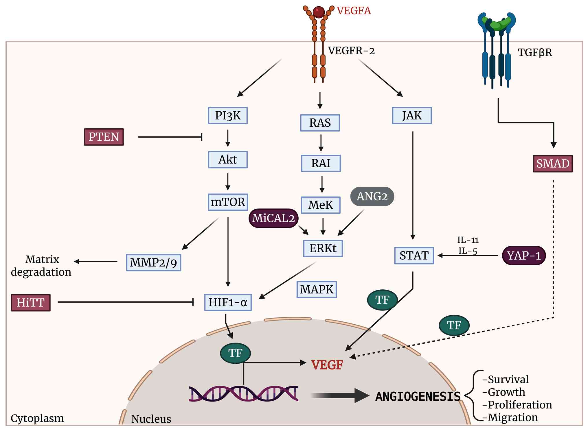 Angiogenesis is essential in physiological processes to provide oxygen and nutrients to tissues for their maintenance and repair. However, angiogenesis can be associated with the onset or progression of pathological processes. Angiogenesis is guided by complex pathways that primarily affect EC, the main cells involved, which undergo several steps for the formation of blood vessels: Matrix degradation, migration, proliferation and survival (20). The angiogenesis switch depends on the resultant molecular balance between pro-angiogenic and anti-angiogenic factors (57). Among the pro-angiogenic factors that act directly on EC, VEGF (58) and fibroblast growth factor (FGF) (59) stand out. VEGFA (a member of VEGF family) binds to VEGF receptor 2 (VEGFR2) inducing dimerization and transautophosphorylation of cell cytoplasmatic tyrosine residues, activating EC migration, survival and vascular permeability through the PI3K/Akt pathway (60). Therefore, the p38 mitogen-activated protein kinase (MAPK) is activated after VEGFA-VEGFR2 interaction and promotes actin remodeling, cell migration and stress response (61). FGF plays a crucial role in angiogenesis and works synergically with VEGF inducing EC proliferation, migration and increase vascular permeability via PI3K/Akt and MAPK (62,63). Also, TGFβ in EC can signal via ALK1 which leads to phosphorylation of R-Smad1/5/8 with the consequent activation of cell migration, proliferation and angiogenesis (64,65). Studies confirm that some pro-angiogenic pathways involved Janus kinases/Signal Transducer and Activators of Transcription (JAK/STAT) which are stimulated by VEGFA-VEGFR2 interaction (66,67). This interaction induces the JAK activation, which phosphorylates STAT proteins, acting as a transcriptional factor of proangiogenic genes such as VEGF (68) (Fig. 2).