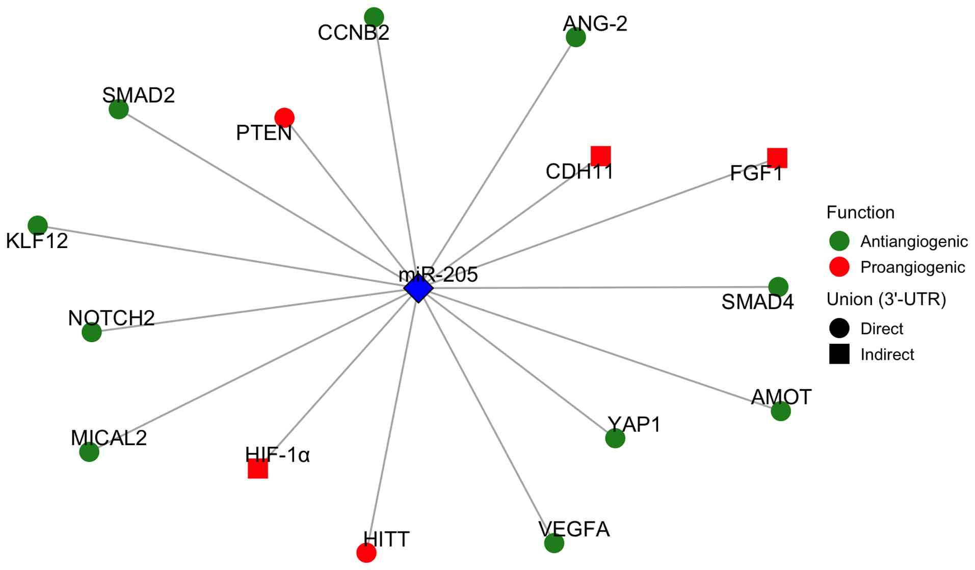 Some of the factors involved in the aforementioned pathways, are regulated by miR-205. miR-205 plays a significant role in the regulation of vascular processes, which, depending on the context including cell type, stimulation and regulated target, can be considered pro-angiogenic or anti-angiogenic (Table I and Fig. 3). The present review aimed to elucidate its dual role as a regulator of angiogenic processes.