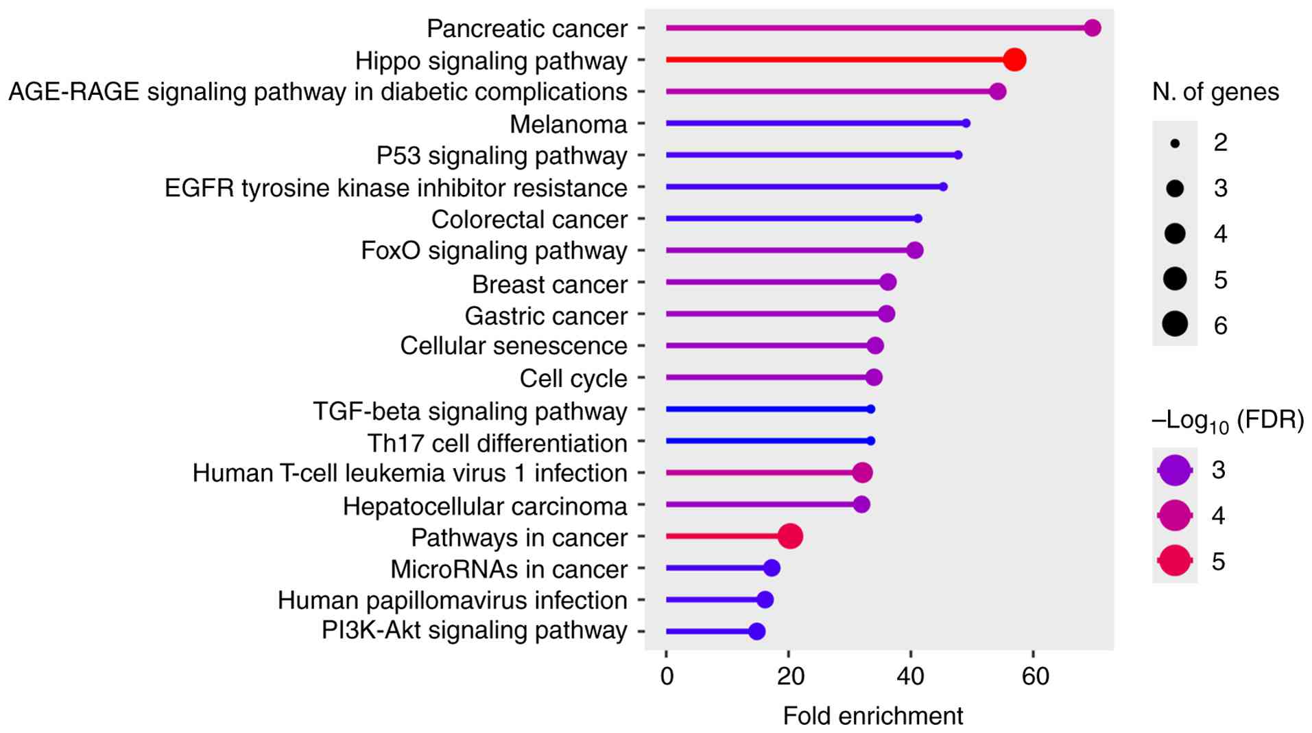 The present review performed an enrichment analysis that revealed that miR-205-associated genes are markedly over-represented in several canonical signaling pathways implicated in angiogenesis, vascular remodeling and diabetic complications (Fig. 4) (24,40,41,65,69-74). Among the most enriched pathways were the Hippo signaling pathway, AGE-RAGE signaling in diabetic complications (69,70), PI3K-Akt (24,73,74), TGF-β (65,71), and p53/EGFR-related cancer pathways (40,41,72), as well as processes linked to cell cycle control, cellular senescence and FoxO signaling (73). These findings suggest that miR-205-5p exerts a broad regulatory influence across interconnected angiogenic and stress-response pathways. Notably, the Hippo/YAP1 and PI3K-Akt/PTEN axes, both central regulators of endothelial proliferation and migration, were among the top enriched categories. In addition, the identification of the AGE-RAGE signaling pathway underscores the potential role of miR-205-5p in hyperglycemia-induced vascular dysfunction (69,70).