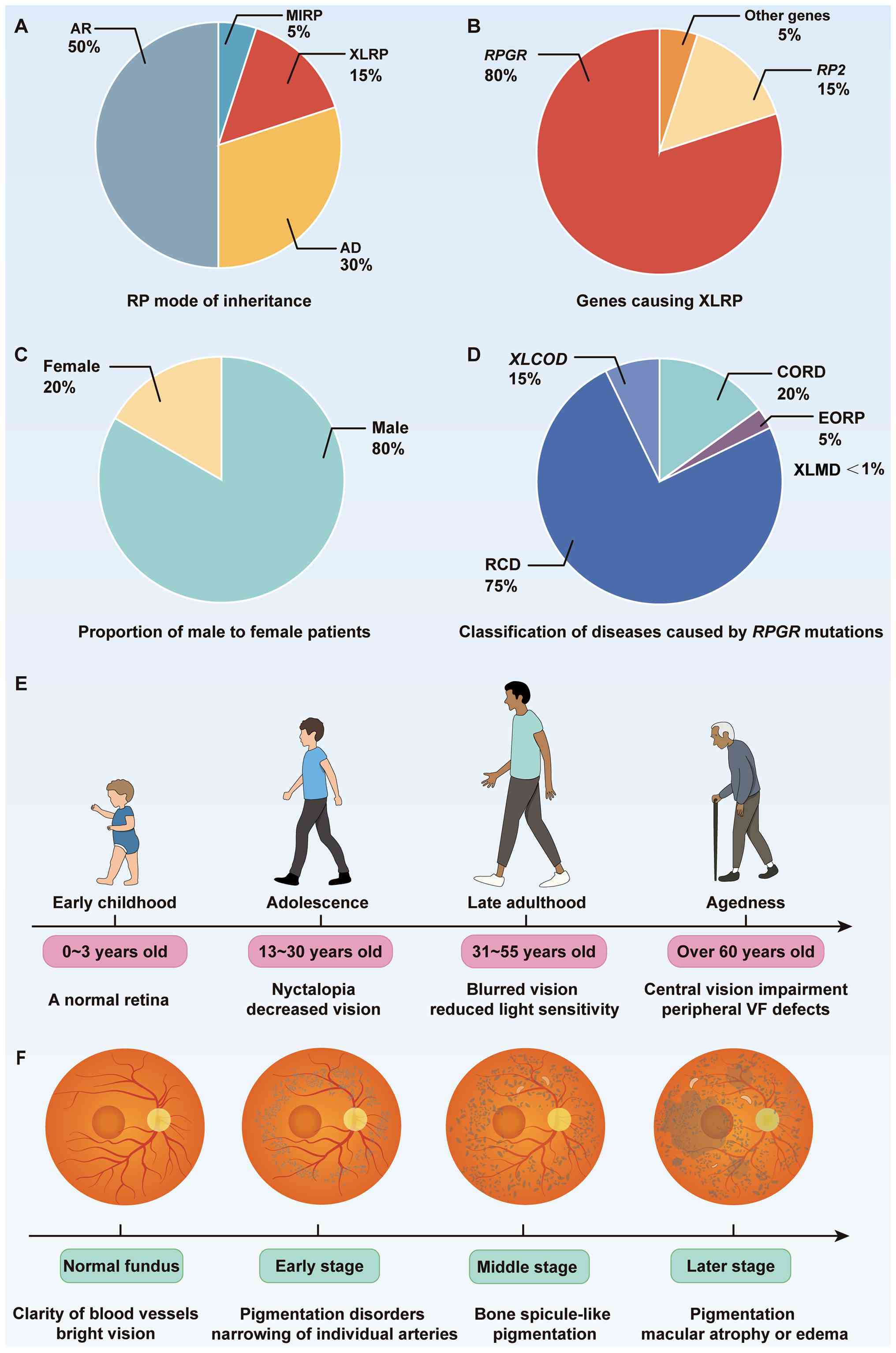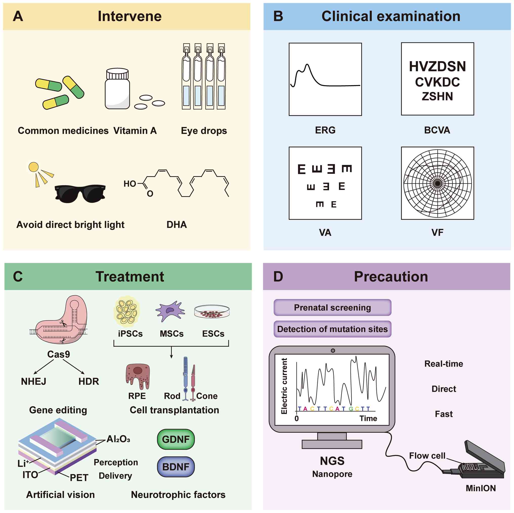 High-precision molecular diagnostics combined with multidimensional analyses are required to characterize the mutation regions of the RPGR of patients, overcoming sequencing limitations and ensuring the reliability of clinical stratification and therapeutic strategies. Integrating early intervention with conventional drugs and emerging approaches such as gene editing, gene replacement and combined neuroprotection, as well as cell transplantation and artificial retinal implantation (Fig. 7B-D), can advance precision medicine for RPGR mutations. These strategies are also expected to provide new directions for the treatment of RP.