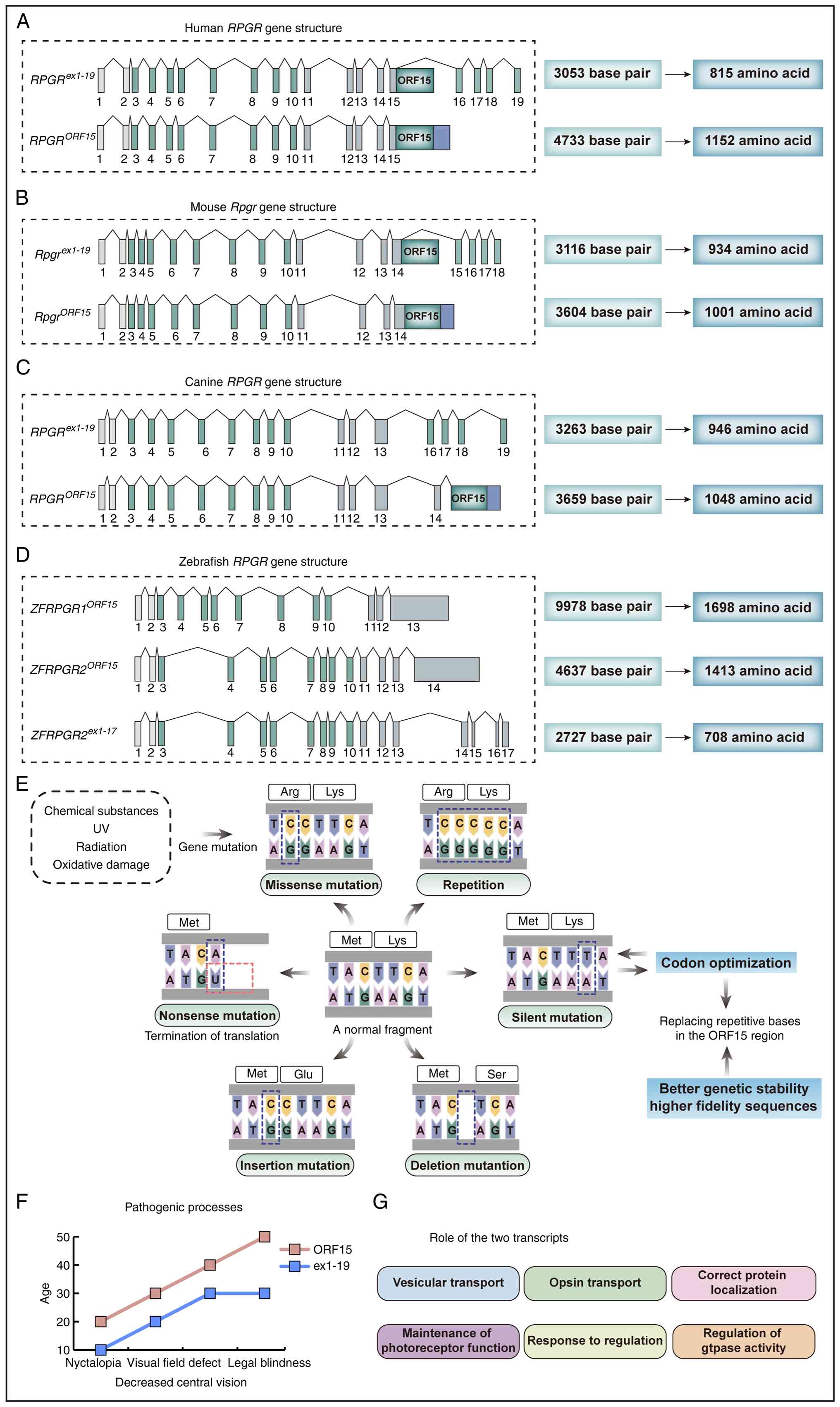 Although considerable progress has been made in gene therapy research on RPGR mutations worldwide and multiple relevant animal models have been established, the key pathogenic mechanisms and pathological features underlying RP caused by RPGR mutations remain incompletely elucidated. Moreover, the translation of these findings into clinical applications continues to face key challenges. For patients with RPGR mutation-associated retinal degeneration, the development of highly sensitive genetic detection technologies (such as long-read sequencing) and functional validation systems is important. A systematic analysis of the population genetic characteristics and the pathogenic mechanisms of RPGR gene mutations will provide a theoretical basis for individualized diagnostic stratification and targeted gene therapy. The present review assesses the types of RPGR gene mutations, pathogenic mechanisms and their effects on photoreceptor cell function reported in recent years. In the present review, the research progress in cross-species models (such as mouse, dog and zebrafish) is summarized and the effectiveness of existing gene therapy strategies [such as adeno-associated virus (AAV)-mediated gene replacement and CRISPR-Cas9 gene editing] in preclinical models is evaluated. Meanwhile, preclinical studies of RPGR gene therapy are also discussed and recent clinical advances are analyzed.