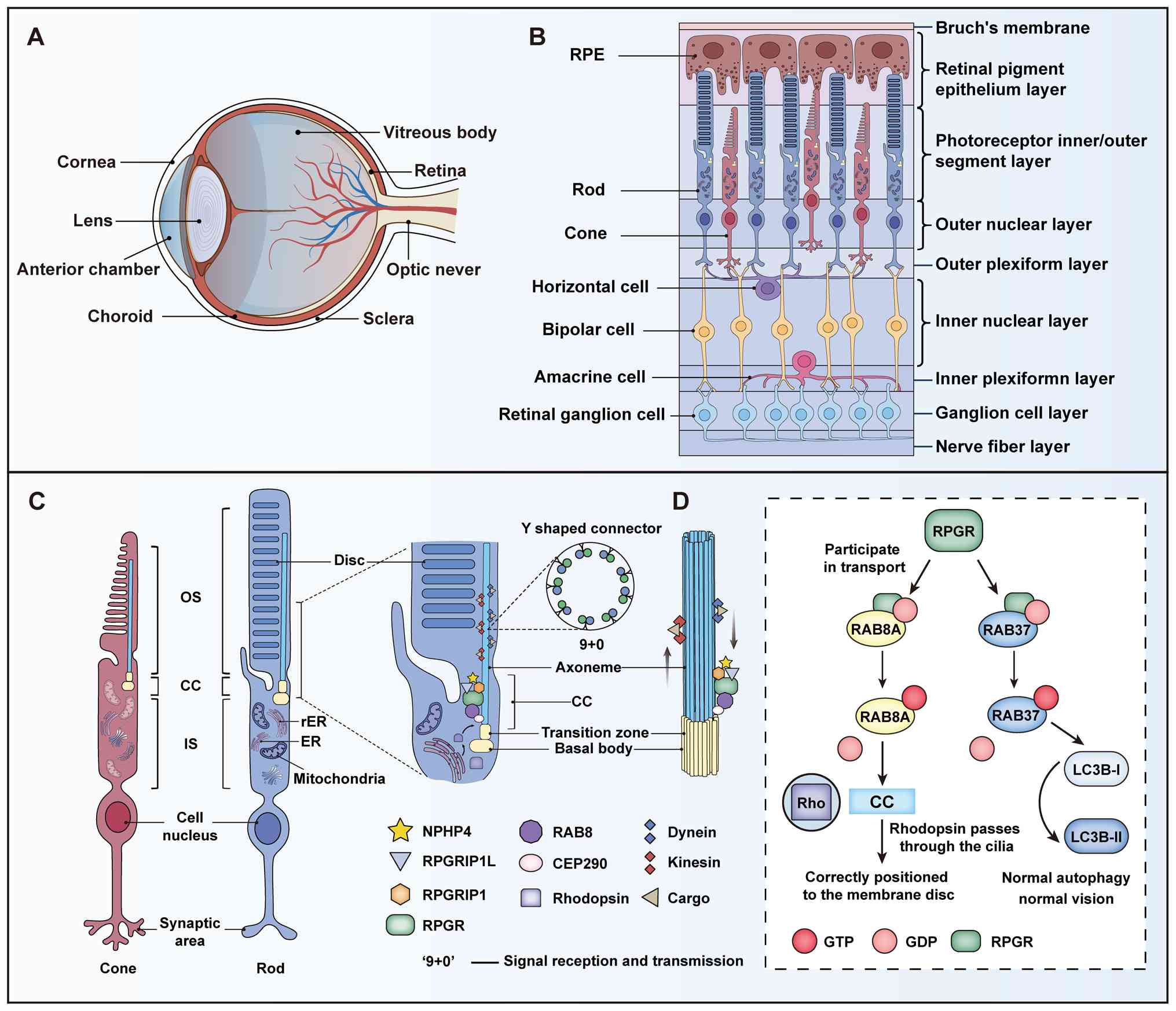 The retina is located at the back of the eye as a curved, multilayered structure comprising photoreceptors, bipolar cells and ganglion cells (Fig. 3A and B). From the outside to the inside, the retinal structure includes the RPE, outer nuclear layer (ONL), outer plexiform layer, inner nuclear layer (INL), inner plexiform layer, ganglion cell layer (GCL) and nerve fiber layer, each of which contributes to the capture and processing of light signals (47-49). Photoreceptors are responsible for detecting light and converting it into electrical signals (50). Rods, which are primarily distributed in the peripheral retina, contain rhodopsin and mediate scotopic vision (51). By contrast, cones are concentrated in the central region and contain three distinct opsins that mediate color discrimination and fine VA under bright light conditions (51,52). Both cell types consist of four main components: The synaptic terminal, the inner segment (IS), the OS and the CC linking the IS and OS (Fig. 3C). The OS is a highly specialized primary cilium characterized by densely stacked membranous discs that serve as the central site of phototransduction. The IS contains organelles such as mitochondria, endoplasmic reticulum and Golgi apparatus, which sustain the high metabolic activity required for photoreceptor function. The CC is structurally homologous to the transition zone of the primary cilium and is essential for the efficient trafficking of proteins and lipids. Owing to their exceptionally high metabolic demands, photoreceptors rely on efficient transport of proteins synthesized in the IS through the CC. This transport is essential to sustain their structure and function (7). As a key component of this intersegmental transport system, the CC requires specific proteins to preserve its structural stability and regulate molecular trafficking. Among these proteins, RPGR acts as a ciliary-associated protein, carrying out a central role in sustaining these processes.