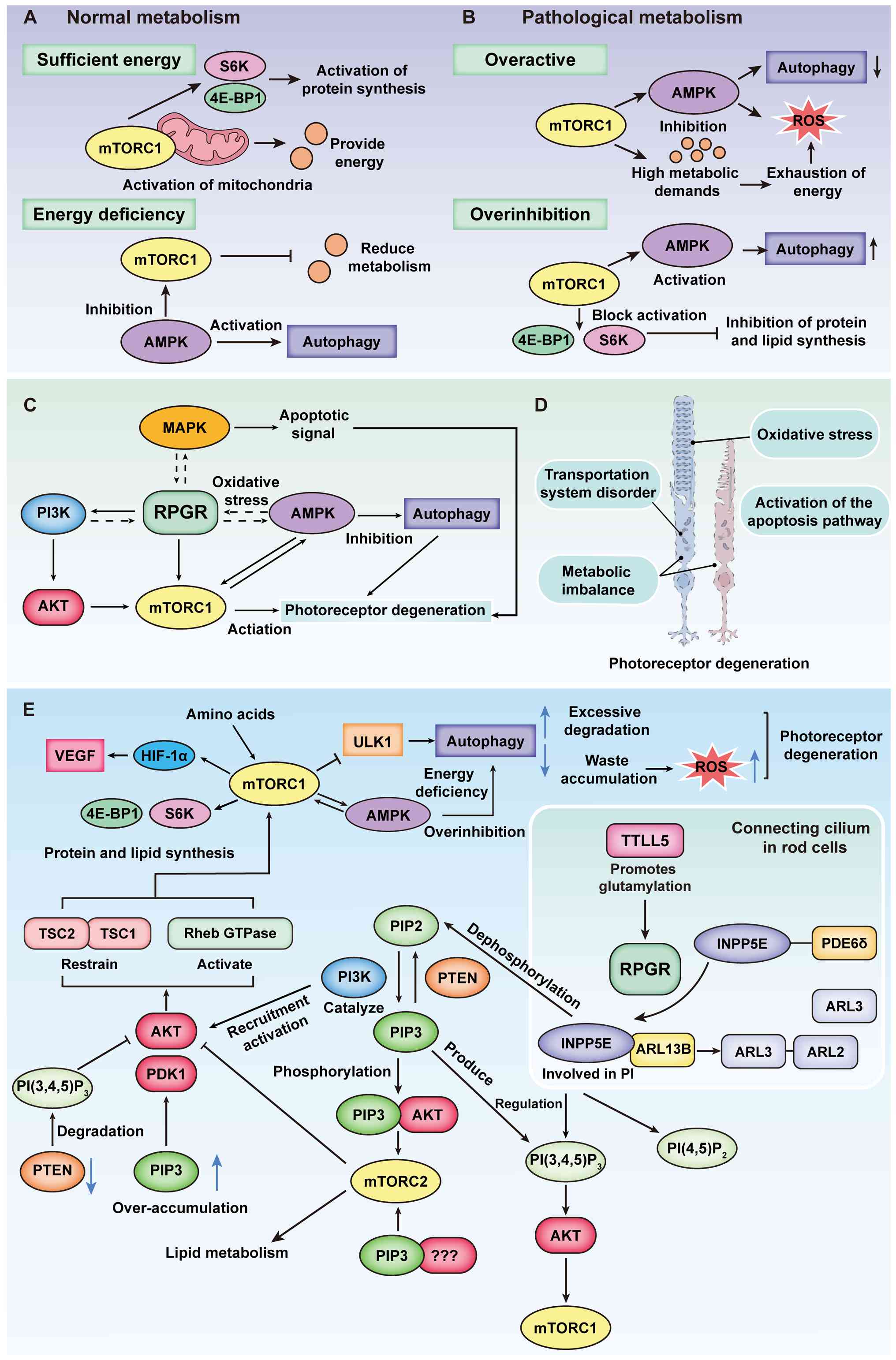 Similar to other neurodegenerative diseases, RP exhibits disruptions in core cellular metabolic pathways, with its pathogenesis involving dysregulation of multi-level molecular signaling networks. Abnormalities in multiple signaling pathways have been shown to lead to photoreceptor loss and apoptosis. These abnormalities include transmembrane signaling disruptions, metabolic dysregulation, oxidative stress and apoptotic pathway activation. Given that RPGR mutations also contribute to photoreceptor degeneration, we hypothesized that RPGR might be associated with these signaling pathways (Fig. 5D). Metabolic homeostasis carries out a key regulatory role in photoreceptor degeneration (Fig. 5A-C). RPGR mutation may disrupt the metabolic homeostasis of photoreceptors through aberrant activation of the mTOR complex 1 (mTORC1) pathway, accelerating their degeneration. mTOR serves as a central regulator of cellular metabolism, primarily controlling lipid synthesis, autophagy and cell growth through the mTORC1 complex (90-92). At the mechanistic level, we hypothesized that the RPGR protein affects phosphatidylinositol metabolism in rods through interactions with PDE6D and INPP5E, leading to the degradation triggered during transport (Fig. 5E). Its deletion results in abnormally elevated levels of phosphatidylinositol (3,4,5)-trisphosphate. This elevation in turn activates the protein kinase B (AKT) signaling pathway, promotes phosphorylation of tuberous sclerosis complex 2 (TSC2) and disrupts Rheb function, resulting in continuous activation of mTORC1. This activation not only promotes anabolic metabolism but also inhibits autophagy and disrupts cellular metabolic homeostasis.