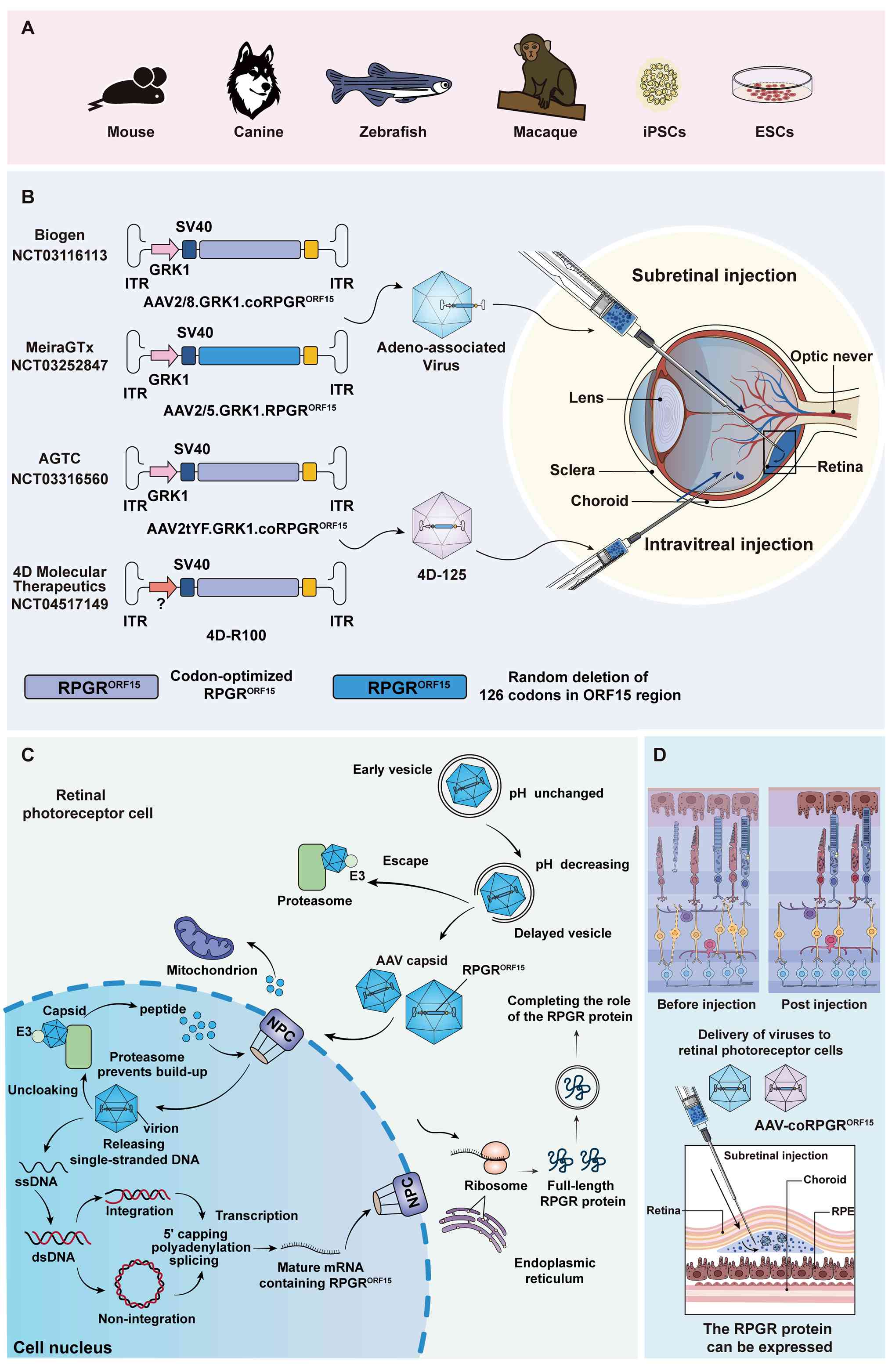 Current clinical studies of gene therapy for RPGR mutation-associated XLRP primarily focus on AAV vector-based gene replacement approaches (9,73,213). The majority of RPGR gene therapy trials have employed the (RK/GRK1 promoter, as aforementioned in the preclinical model section, the core advantages of this promoter lie in two aspects: Its precise targeting of retinal photoreceptor cells and its compatibility with the packaging capacity limitations of AAV vectors. The main variations among the different studies concern the viral subtypes and the selection of coding sequences (Fig. 6B). To date, four clinical trials have been reported, each sponsored by a different company: i) Biogen Inc. (NCT03116113), AAV2/8. hRK.coRPGRORF15 carrying a codon-optimized RPGRORF15 cDNA sequence. ii) MeiraGTx (NCT03252847), AAV2/5. hRK.RPGRORF15 without codon optimization; iii) AGTC (NCT03316560), AAV2tYF.GRK1.coRPGRORF15 employing an AAV2 capsid containing a single tyrosine-to-phenylalanine (Y→F) substitution (10); iv) 4D Molecular Therapeutics (NCT04517149): 4D-R100-based vector carrying codon-optimized human RPGR. R100 is an AAV capsid engineered through directed evolution, characterized by highly efficient targeting of retinal photoreceptor cells.