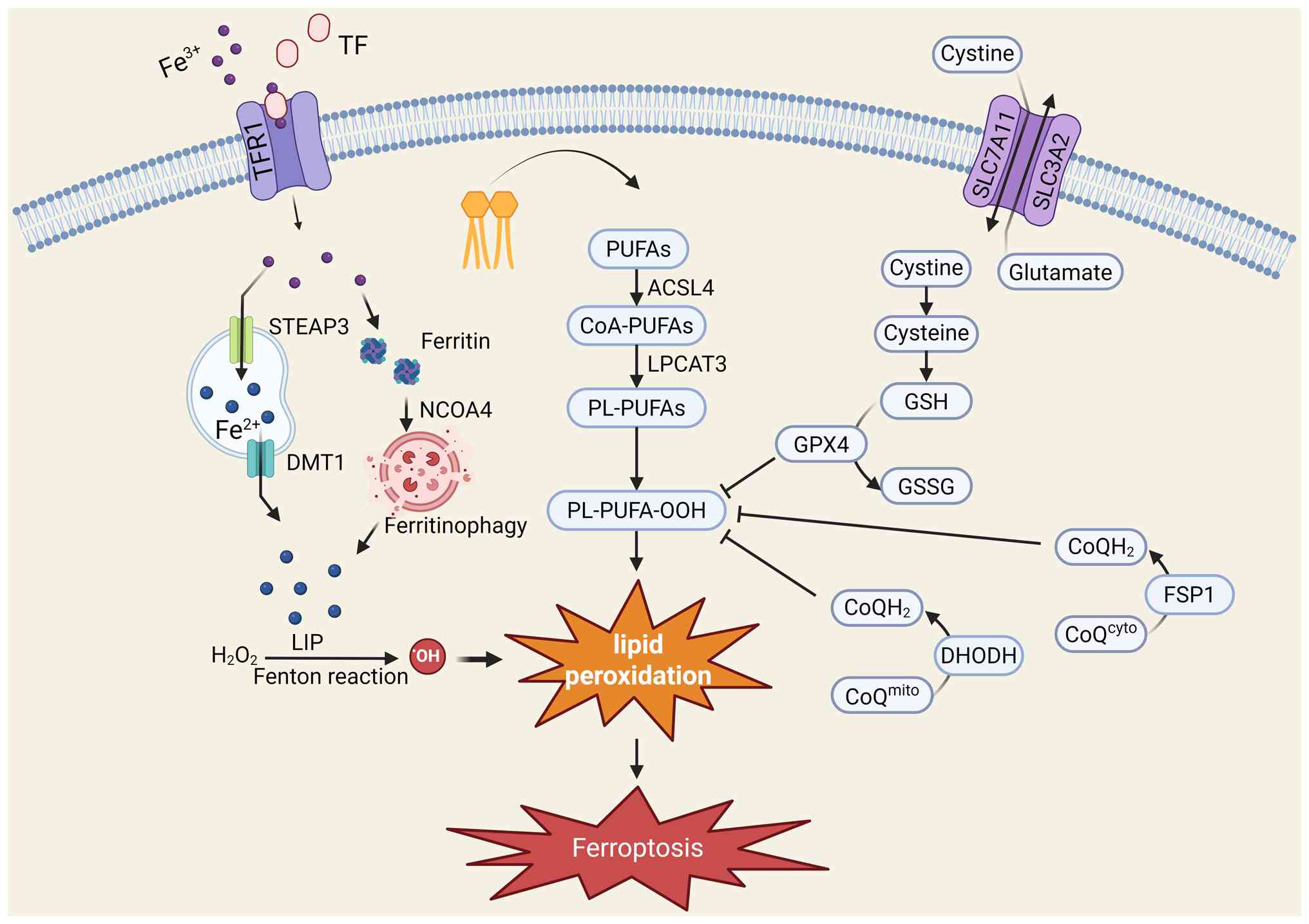 Fe2+ within the LIP is central to the catalysis of ferroptosis; it participates in the Fenton reaction, which decomposes H2O2, a byproduct of cellular metabolism, into highly reactive hydroxyl radicals. Hydroxyl radicals are among the most potent reactive oxygen species (ROS) and can non-specifically attack membrane PUFAs, thereby triggering intense lipid peroxidation (20).