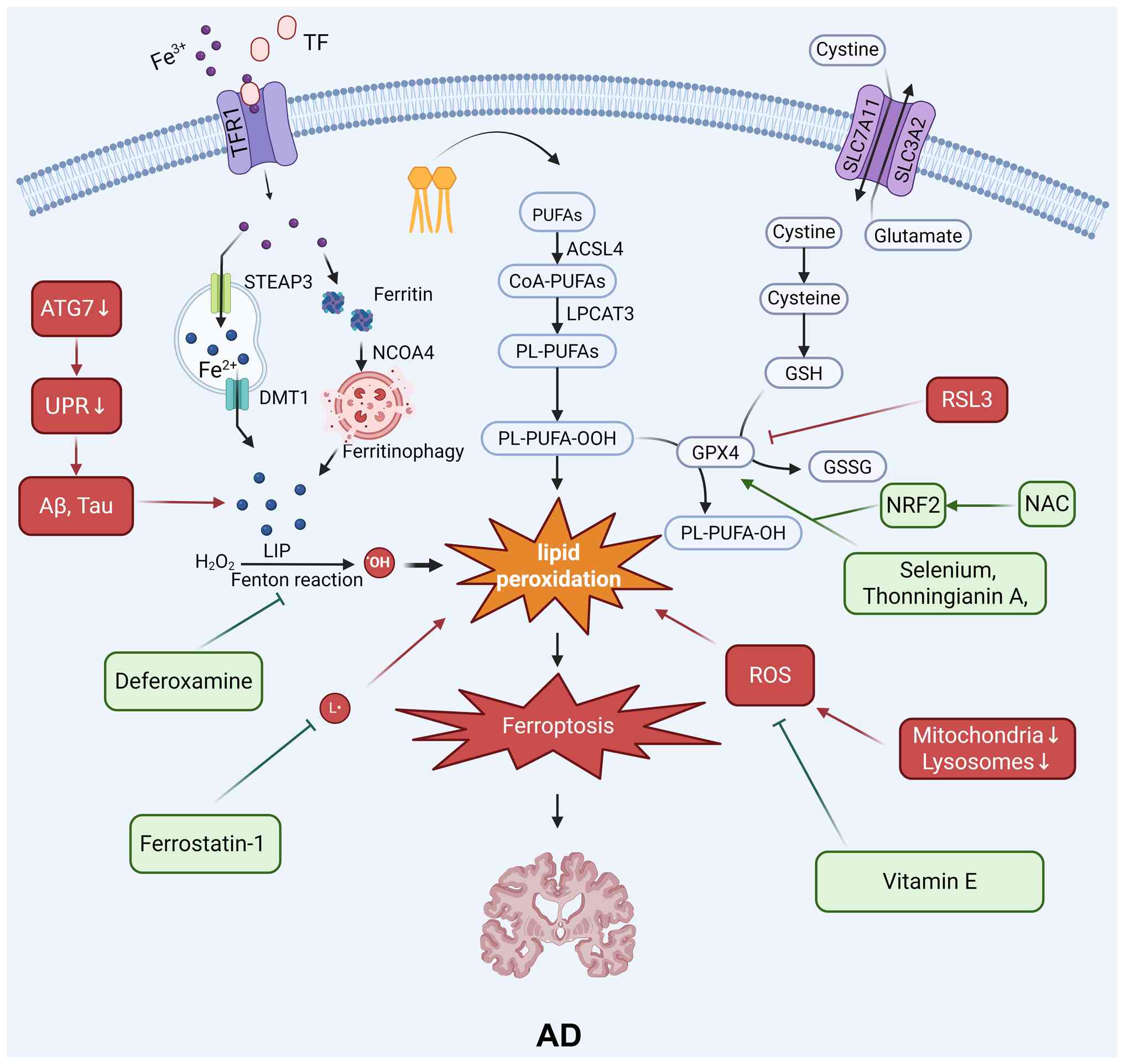 Cognitive impairment in AD is closely associated with disrupted iron homeostasis, excessive oxidative stress and the accumulation of Aβ and tau proteins, which collectively promote ferroptosis. Several natural compounds have been found to be effective at modulating ferroptosis-related pathways to counteract these processes.