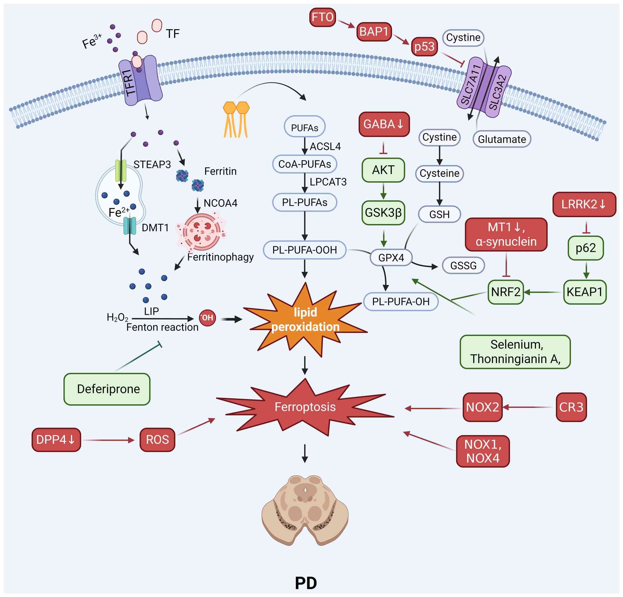 The degeneration of dopaminergic neurons in PD is fueled by iron overload, mitochondrial dysfunction and oxidative stress, all of which are tightly linked to ferroptosis. Therapeutic strategies have therefore focused on disrupting these pathological cycles.