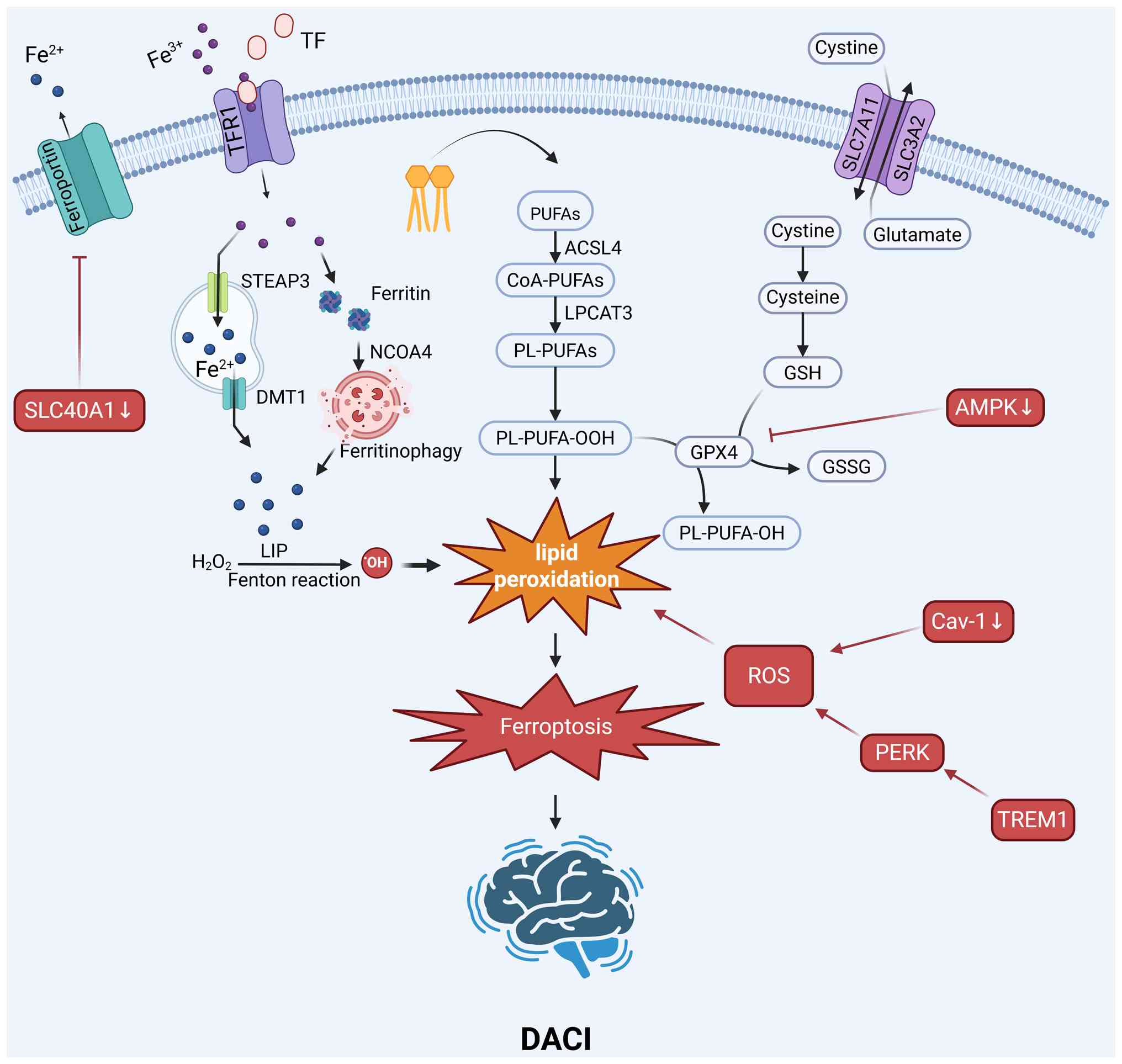 Other approaches aim to correct the iron and ROS imbalance directly. Erythropoietin has been shown to improve cognition by reducing iron overload and lipid peroxidation in diabetic models (68). Resveratrol inhibits the ability of microRNA-9-3p to upregulate SLC7A11 expression, thereby improving cognition in the context of DACI (138).