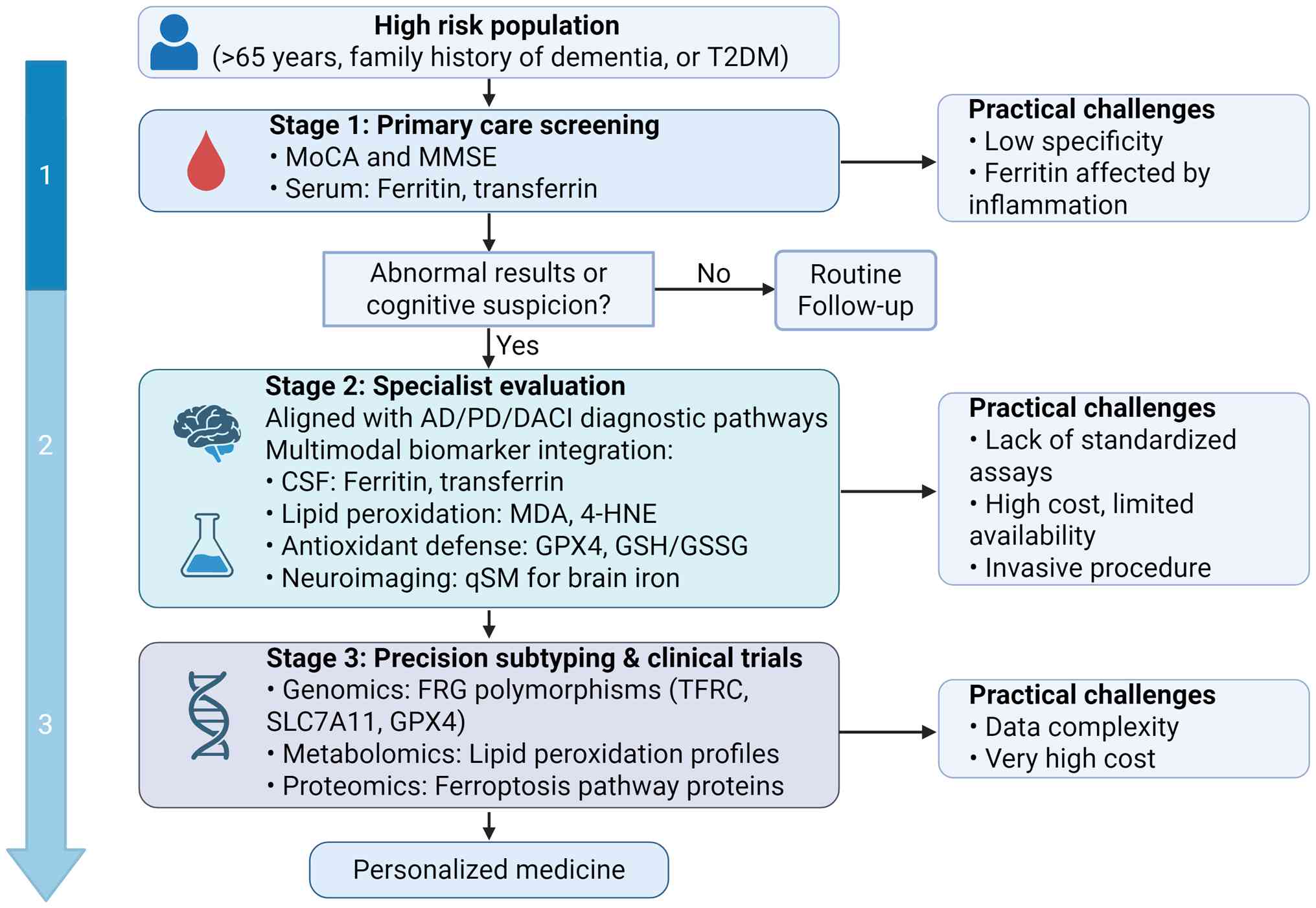 A major challenge in translating ferroptosis research from the laboratory to clinical practice is how to integrate ferroptosis biomarkers into current diagnostic pathways for cognitive impairment. A stepwise clinical workflow may provide a practical framework for this translation (Fig. 5).