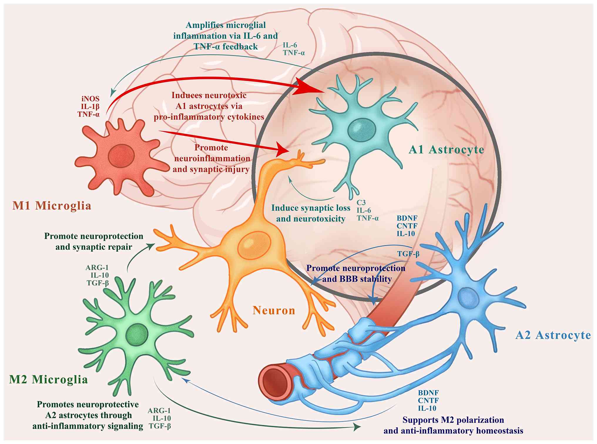 Neuroinflammation and aberrant immune regulation play pivotal roles in the pathogenesis of ASD, with the activation of microglia and astrocytes constituting a core cellular foundation of this neuroinflammatory process. Microglia and astrocytes exhibit distinct polarization states in the neuroinflammatory microenvironment of ASD, with M1/A1 subtypes promoting injury and M2/A2 subtypes supporting repair. The interplay of these brain cells is summarized below and illustrated in Fig. 1.