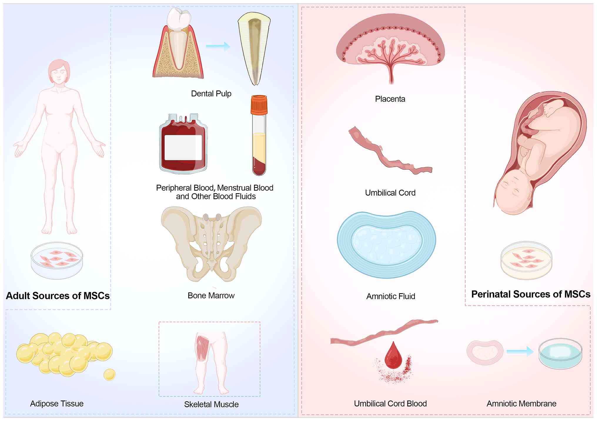 MSCs are adult stem cells characterized by multipotent differentiation and self-renewal capacities, initially identified in bone marrow by Friedenstein et al (87). These cells adhere to plastic culture flasks and exhibit robust biological functions. They are widely distributed in various tissues, such as bone marrow, adipose tissue, umbilical cord, placenta, and dental pulp (88). A schematic overview of these MSC sources is illustrated in Fig. 2. Owing to their diverse sources and distinct functional properties, have emerged as a significant research focus in regenerative medicine and cell therapy.
