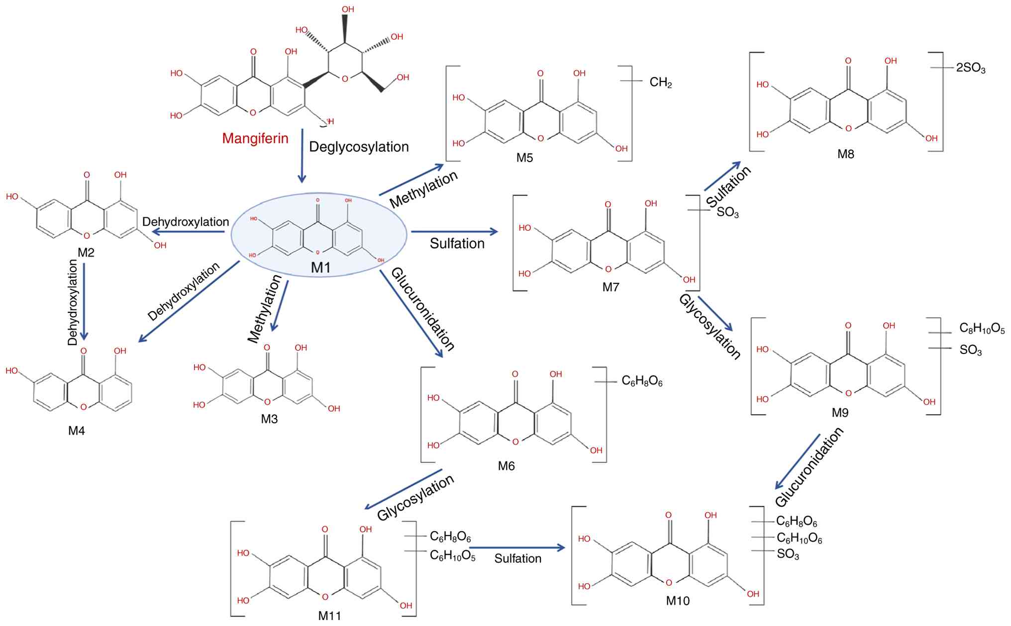 Zhou H, Song S, Lan X, Li Y, Yuan X, Yang J, Li M, Cao T and Zhang J: Comprehensive profiling of mangiferin metabolites in vivo and in vitro based on the 'drug metabolite clusters' analytical strategy. ACS Omega. 8:9934–9946. 2023. View Article : Google Scholar : PubMed/NCBI | |