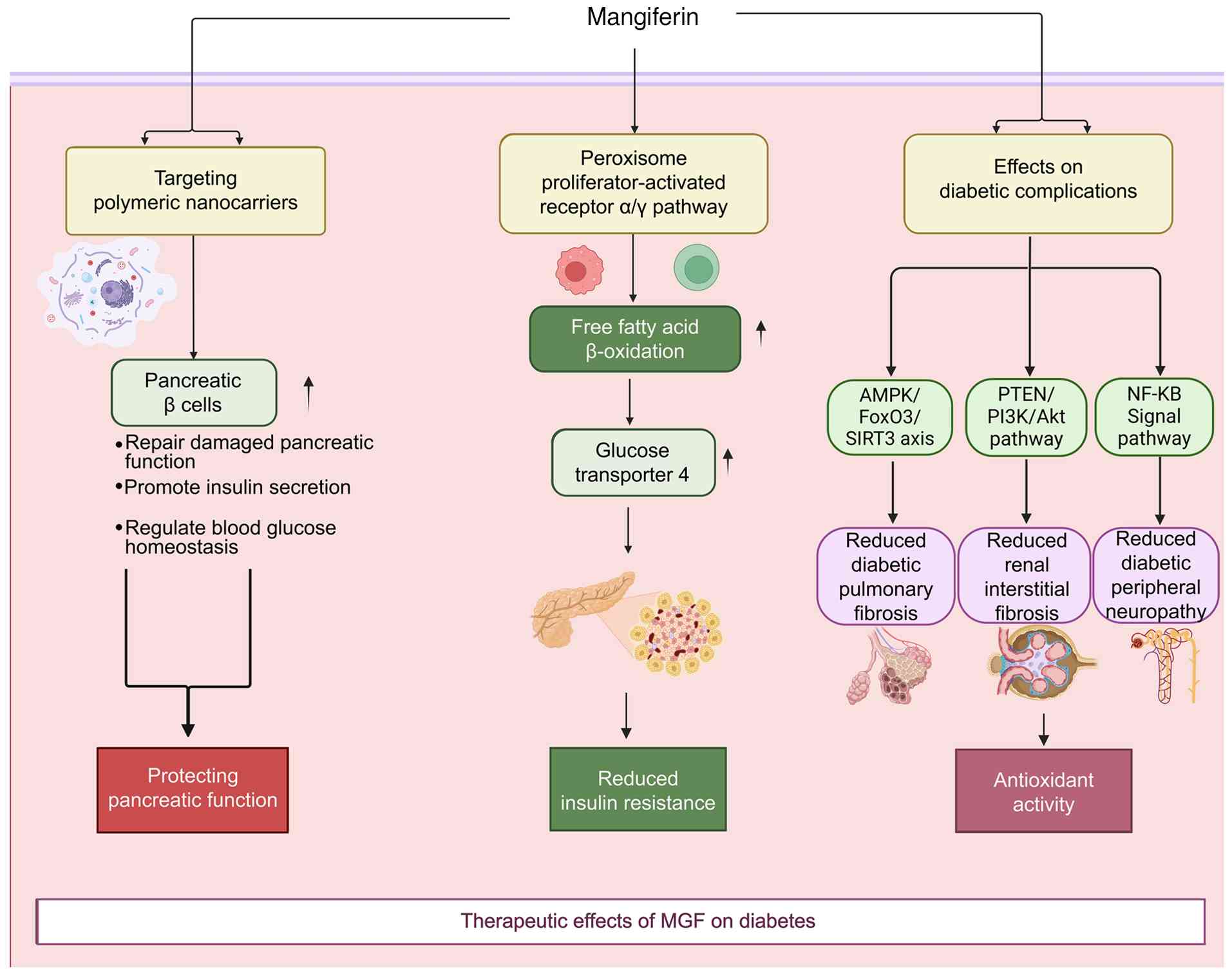 In addition to its ability to control glycemia, MGF has shown activity against diabetic complications in preclinical models. In a mouse model of diabetic pulmonary fibrosis, oral administration of 60 mg/kg MGF every 3 days for 4 weeks has been shown to reduce the progression of fibrosis. Reported effects include the inhibition of endothelial-mesenchymal transition and modulation of the AMPK/FoxO3/sirtuin (SIRT)3 pathway, as evidenced by changes in pathway proteins and fibrosis markers (33). In streptozotocin-induced diabetic mice, oral administration of 15-60 mg/kg/day MGF for 4 weeks may attenuate renal injury, which is consistent with diabetic nephropathy. This previous study reported downregulation of phosphatase and tensin homolog (PTEN)/PI3K/Akt signaling, and reduced expression of fibronectin, collagen I and α-smooth muscle actin (α-SMA), along with decreases in renal fibrosis, inflammation and oxidative stress endpoints (34). Taken together, these data support a potential role for MGF in mitigating pulmonary and renal complications of diabetes under experimental conditions, while confirming that the proposed mechanisms, including inhibition of endothelial-mesenchymal transition and modulation of AMPK/FoxO3/SIRT3 signaling in diabetic pulmonary fibrosis, and downregulation of PTEN/PI3K/Akt signaling with reduced fibronectin/collagen I/α-SMA expression in diabetic nephropathy, are supported by molecular endpoints measured in these models (33,34).