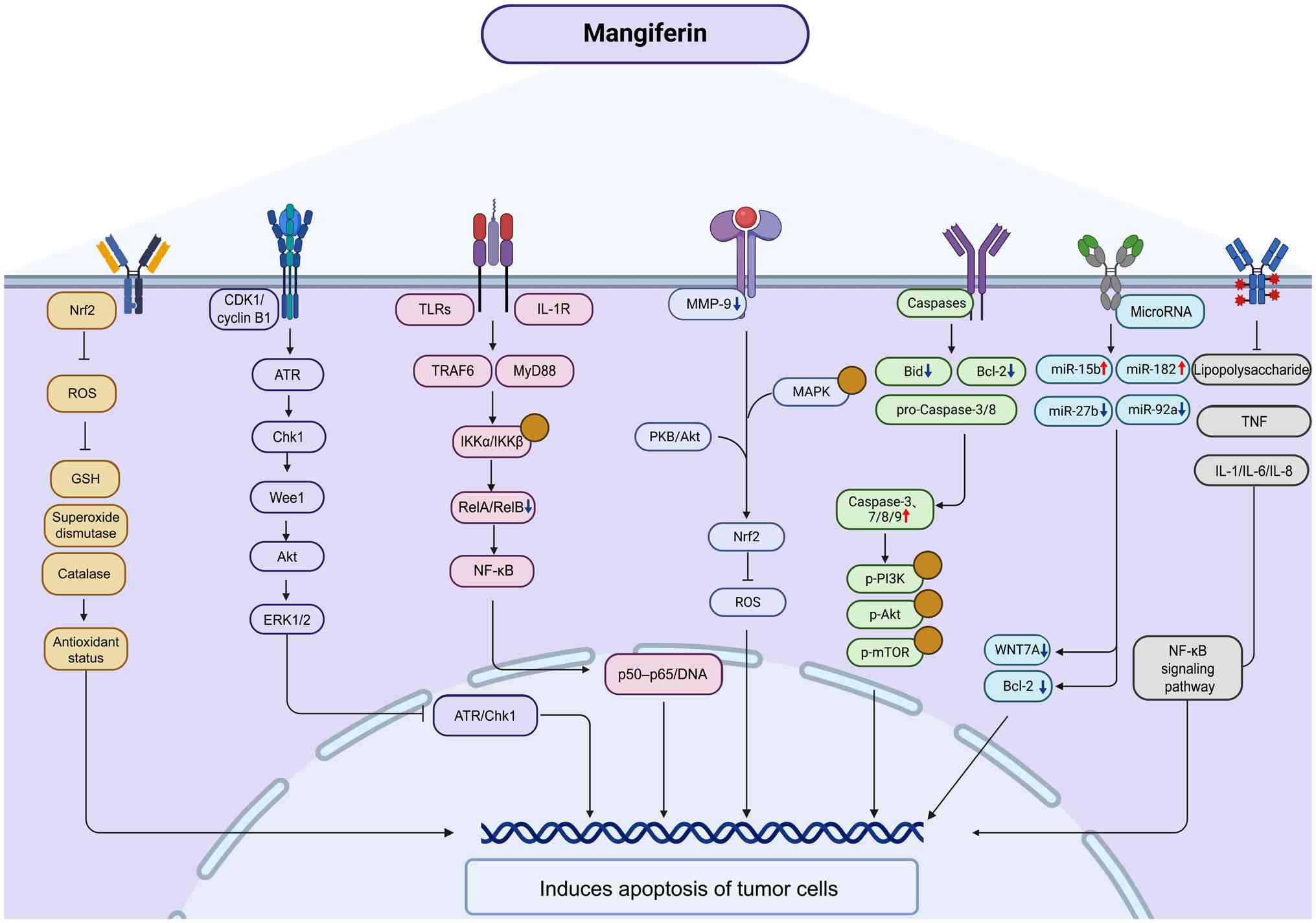MGF exerts potent anticancer activity through multiple mechanisms that target key cellular processes underlying tumor initiation and progression. These include the induction of cell cycle arrest, the promotion of apoptosis through various intracellular pathways, the inhibition of tumor invasion and metastasis, the modulation of immune responses, and the enhancement of radiosensitivity in cancer such as glioblastoma (GBM) (36,37). Fig. 4 schematically summarizes the major signaling pathways [such as nuclear factor erythroid 2-related factor 2 (Nrf2)/reactive oxygen species (ROS), ATR/Chk1, CDK1/cyclin B1, NF-κB, PI3K/Akt, MAPK, caspases and microRNAs (miRNAs/miRs)] through which MGF induces apoptosis of tumor cells.