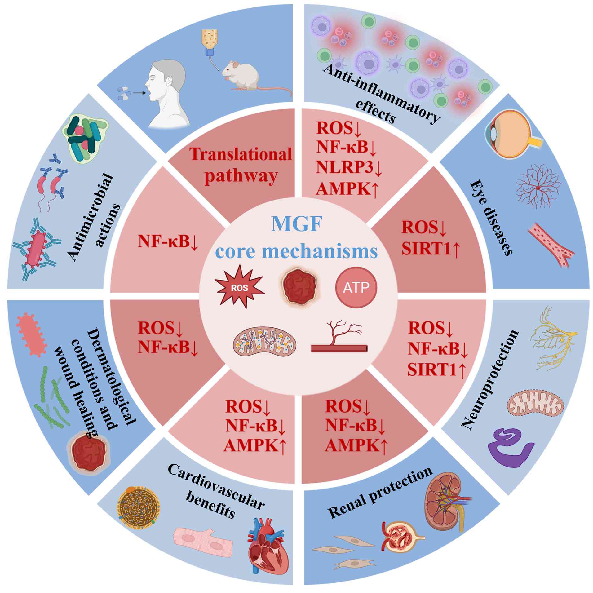 Renal dysfunction, often driven by oxidative stress and inflammation, contributes to the pathogenesis of acute and chronic kidney diseases. MGF has demonstrated renoprotective effects across a range of kidney injury models by modulating inflammation, oxidative stress and fibrotic signaling pathways (140).