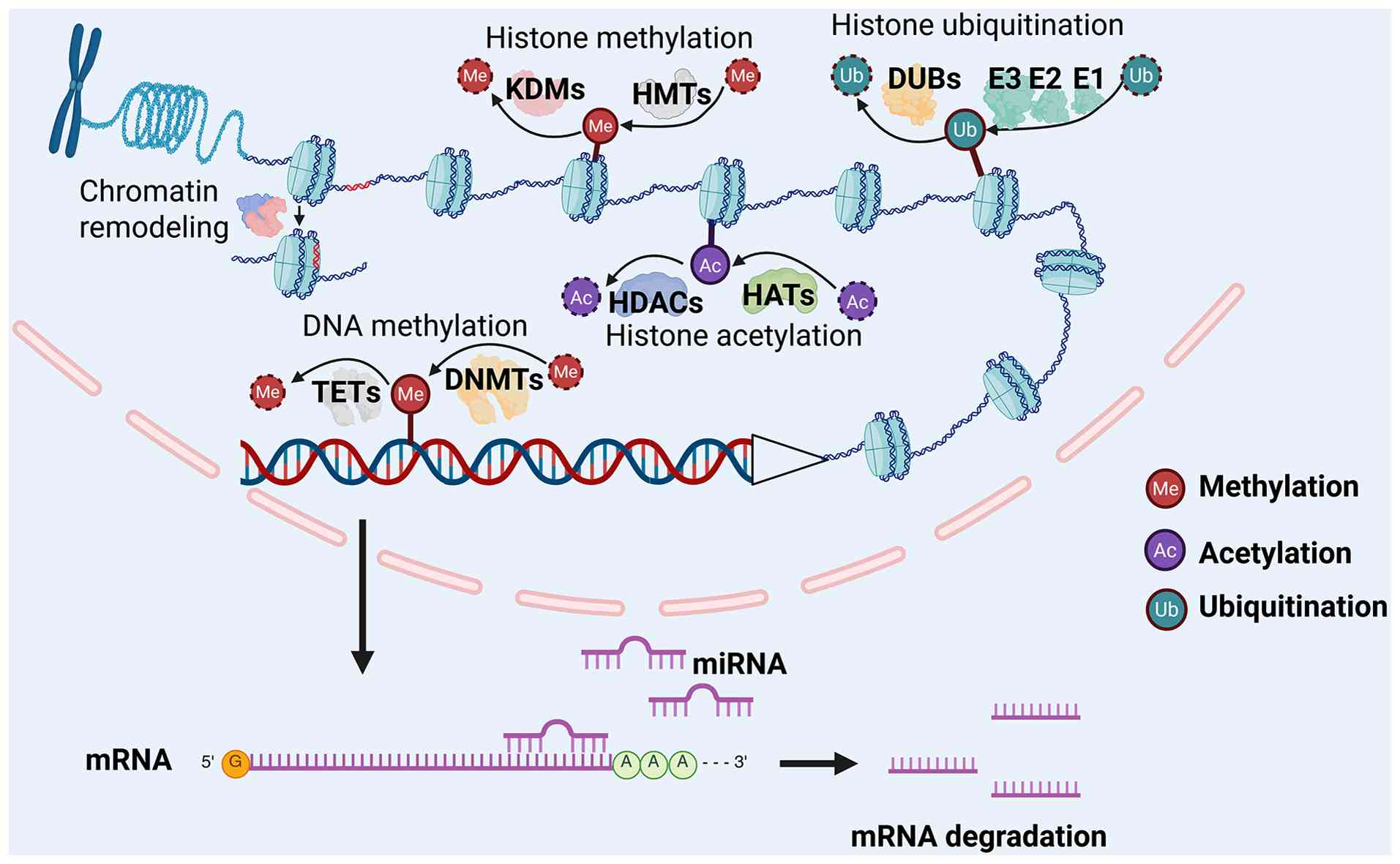 Four core histones and their variant isoforms assemble into the fundamental repeating unit of chromatin, the nucleosome. These nucleosomal histones undergo a variety of covalent post-translational modifications, such as methylation, acetylation, phosphorylation, ADP-ribosylation, ubiquitination, and SUMOylation, which collectively constitute a complex 'histone code' (22). A cohort of specialized enzymes catalyzes the 'writing', 'erasing' and 'reading' of these marks. For instance, histone acetylation is catalyzed by histone acetyltransferases (HATs) such as PCAF, GCN5 and the CREBBP/p300 complex, whereas histone deacetylases (HDACs), including HDAC1-3 and the sirtuin family (SIRT1-7), remove acetyl groups to facilitate chromatin compaction and transcriptional repression (23,24). Histone methylation is installed by histone methyltransferases (HMTs), including the KMT2 family, PRC2 complex, SUV39H1/2, and PRMT1, which deposit mono-, di- and tri-methyl marks on lysine (K) or arginine (R) residues (25). Conversely, histone demethylases (KDMs), such as LSD1/KDM1A and members of the jumonji domain family, 'erase' methyl modifications in a residue- and methylation-state-specific manner (25). Histone ubiquitination involves a cascade of reactions that covalently attach ubiquitin to lysine side chains, mediated by the E1 activating enzyme, E2 conjugating enzyme, and E3 ligases (such as RNF20/40 and RING1A/B). This modification is reversed by deubiquitinases, such as USP16, USP22 and BAP1 (26,27). Functionally, these histone modifications modulate chromatin biophysics, govern the recruitment or exclusion of transcriptional regulators, and delineate distinct chromatin domains, such as euchromatin and heterochromatin, thereby providing a pivotal epigenetic layer of gene expression control (28).