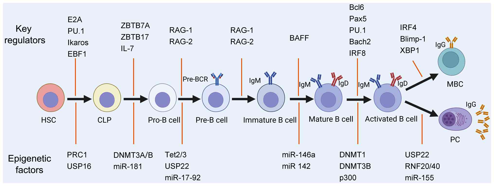 B-cells develop from hematopoietic stem cells (HSCs) in the bone marrow (BM) of adult mammals or in the fetal liver during embryogenesis (1). The sequential and coordinated expression of lineage-specifying transcription factors, including E2A, PU.1, Ikaros and EBF1, drives HSCs into early lymphoid progenitors (ELPs), which activate lymphoid-restricted gene programs indicative of B-cell potential (2). ELPs, characterized by interleukin (IL)-7 receptor (IL-7R, CD127) negativity, subsequently differentiate into common lymphoid progenitors (CLPs) in the BM. CLPs serve as immediate precursors not only for B-cells, but also for T-cells, natural killer cells and dendritic cells (3). B-cell maturation proceeds through discrete stages, including pro-B, pre-B, immature B and mature B-cells, under the coordinated control of transcription factors (including E2A, Pax5, PU.1, Ikaros, EBF1, Sox4, IRF4 and IRF8) and cytokines such as IL-7 (1). During these stages, developing B-cells undergo tightly ordered V(D)J recombination events to assemble a functional, non-autoreactive heterodimeric B-cell receptor (BCR), thereby equipping them for antigen recognition and adaptive immune responses. Once they migrate to secondary lymphoid organs, mature B-cells can be activated via T-cell-dependent (TD) or T-cell-independent (TI) pathways and differentiate into antibody-secreting plasma cells (PCs) and long-lived memory B-cells (MBCs) (4).