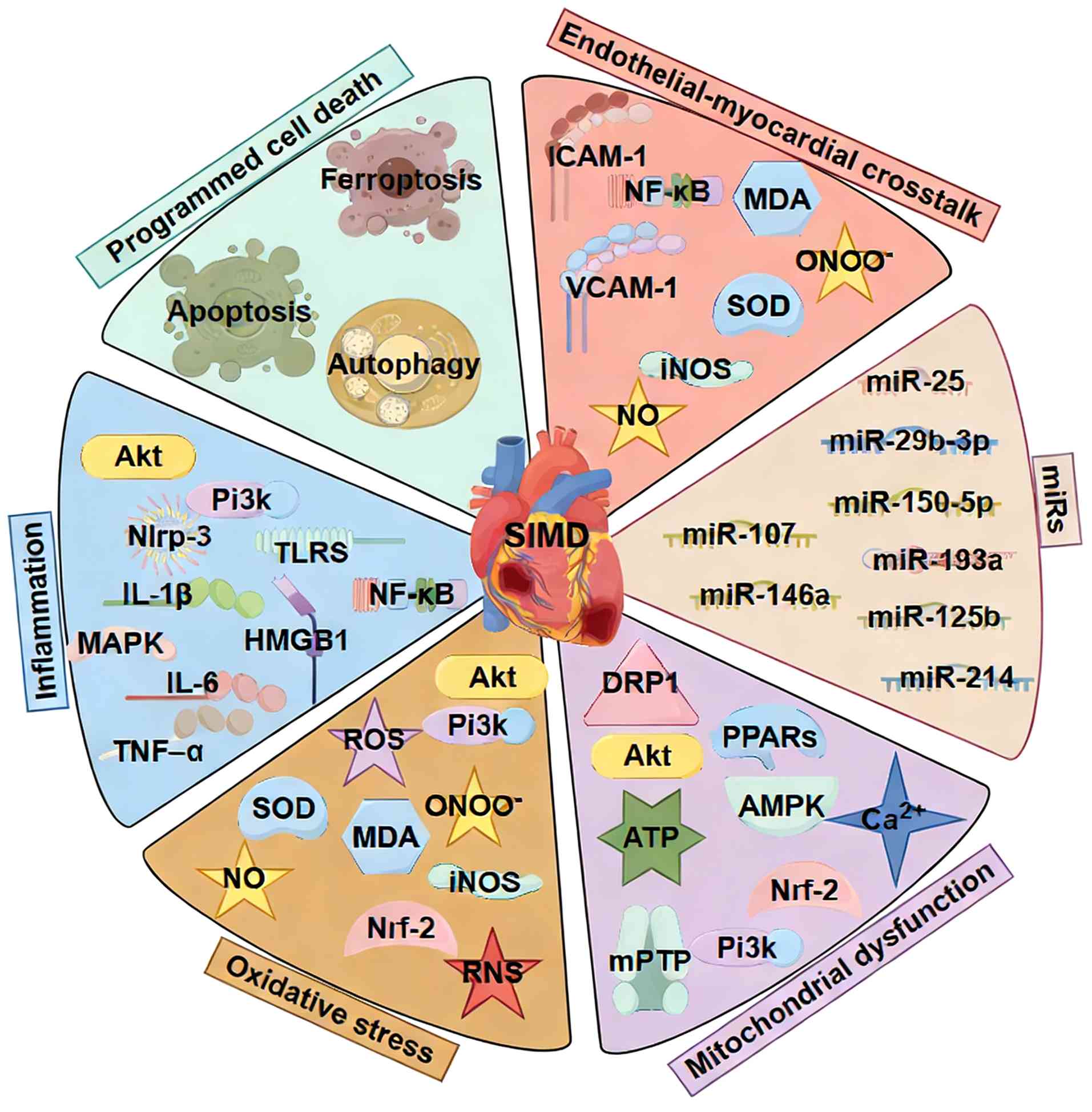 The pathophysiology of SIMD is complex and multifactorial. Interplay of cytokine storm, excessive generation of ROS and RNS, mitochondrial dysfunction and dysregulated endothelial-myocardial crosstalk collectively drive cardiomyocyte apoptosis, ferroptosis and microcirculatory impairment.