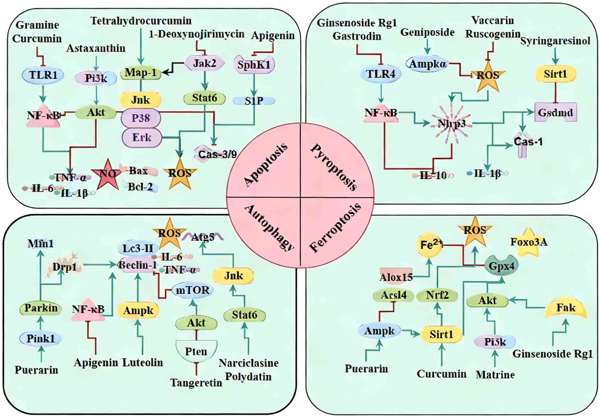 Programmed cell death pathways implicated in SIMD include apoptosis, pyroptosis, autophagy and ferroptosis. Natural products can confer cardioprotection by either enhancing cell survival signals or inhibiting specific death pathways (Fig. 2).