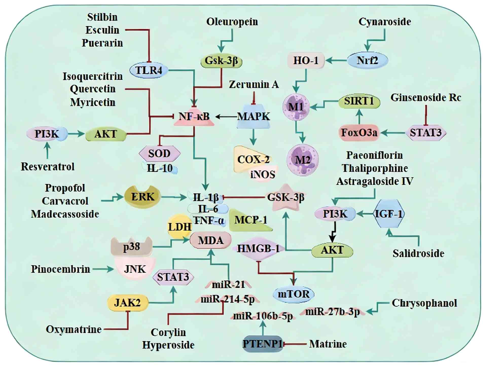 In summary, these natural products protect against SIMD by inhibiting TLR4/NF-κB and MAPK signaling, activating PI3K/Akt, modulating miRNA networks and promoting macrophage M2 polarization. They collectively reduce proinflammatory cytokine levels, limit inflammatory cell infiltration and improve cardiac function and survival rate.